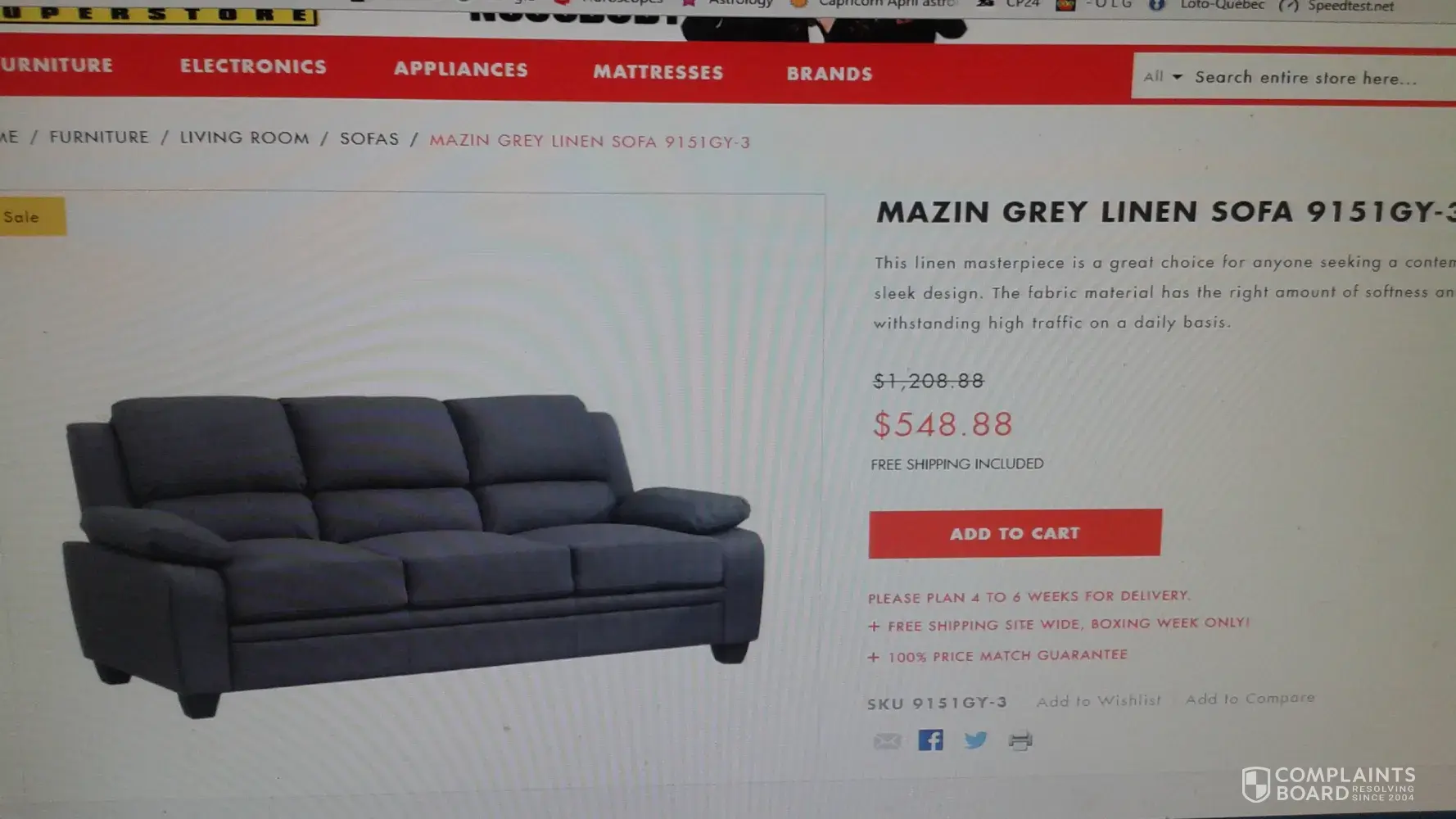 The third item was a sofa (Mazin Linen Fabric Sofa in Grey 9151GY). This sofa lasted only 3 month's! The center of the seating area sunk! Was under warranty. The guy came over and took pictures. Was told that nothing will be done as it was due to wear and tear. He based it on my weight I guesss as I am over weight.
