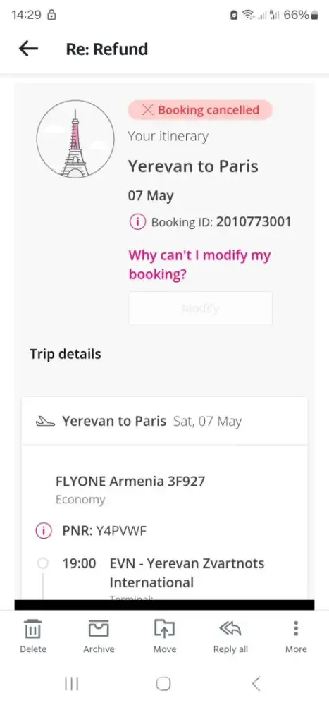 01-04-23 I received confirmation of the booking to Catania departing on 27th March stating that check in for the outward-bound flight was on 26-03-24. (Booking ID: 2329071488). I have the documents to prove this.