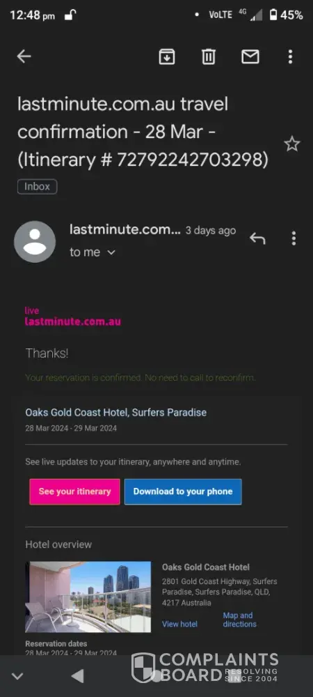 Booked a room at around 930pm on 28/3/24 on lastminute.com for one night at the oaks hotel surfers paradise.