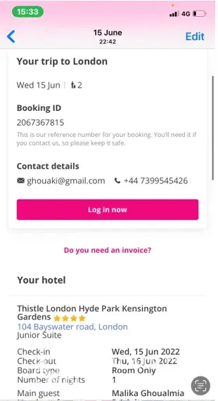 On 15th June 2022, I booked a Hotel room at the Thistle London Hyde Park Kensington Gardens the booking time was at 22:42.