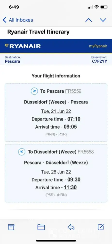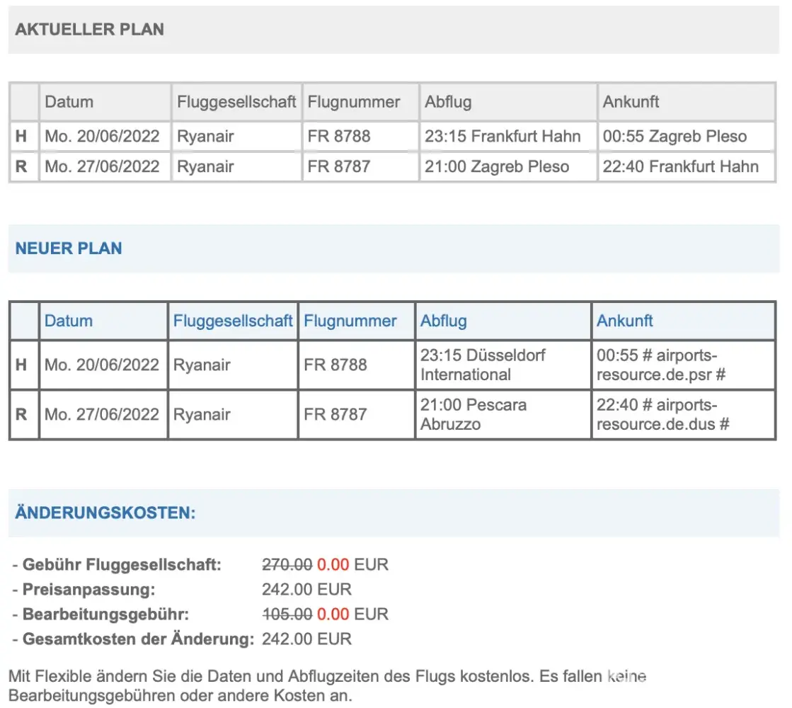 9. (9.June) We asked for a change of date then, another option was cheaper. Again Düsseldorf Weeze - Pescara, Italy. Just 1 day later. Online the ticket was available for 130€. Again, they would send the request to the other department to check the tickets and to send us the offer.