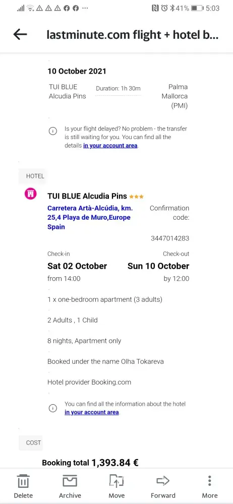 I've canceled my booking (from Ireland to Mallorca) [Hotel + Flight], and here is the booking ID number: [[protected]]. I paid 1, 393.84 € for Hotel+Flight. The price for the tickets is 481 € on Ryanair Web page and the rest 915 €for hotel only.