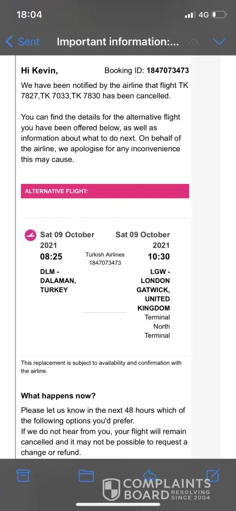My return flight with Turkish Airlines from Dalaman, Turkey to London on Saturday October 9th was cancelled. At first our replacement flight left us stranded in Istanbul, not London. Eventually this was changed with a flight to London Stanstead, but with a 5hr 20 min layover in Istanbul, with us only landing in the evening. The email change says you 48 hours to accepts the flight change, request alternative flights, or demand a refund. But if you click on any of the buttons/links, they redirect you to an error page. The links don't work. I called them up to request a flight change to the direct Dalaman to London Gatwick flight on the same date also with Turkish airlines. I also explained that I didn't need to return to Stanstead and that any London airport would work and that I wanted the shortest travel time. The agent on the call said they'd make a note on the system. Several days later I got an email offering the flight I wanted, but again he links to accept etc didn't work, so I called them up again. The agent on the call again said they'd make a note in the system to confirm my flight acceptance for the Gatwick flight, and that a confirmation email would take several days. Instead I got a new email showing me the flight was changed back to the original change I didn't want - Dalaman to Istanbul, 5hr 20min layover, and eventually to Gatwick. Again the buttons/links on the email to change flights didn't work so I called again. This time the least helpful agent said that the flight to Gatwick must've gone or that I didn't respond in time, even though I responded within 24 hours, and the email said I had 48 hours to respond. He then said that perhaps the flight didn't exist anymore even though I ensured him the flight to Gatwick still existed, and was available to book through lastminute.com with the same Turkish Airlines (the same flight it's always been), so should be able to just change my flight to that one like I wanted to change to and accept in the first place. But again all he could say was that he'd make a note in the system. Like every other agent had said. But I just wanted to confirm the Gatwick flight. He said if a new email arrives with the new flight details to call again to confirm… something I've been trying to do on 3 separate occasions. He also couldn't tell me if I'd get a refund or how much it'd even be worth. And refused to let me speak to a manager or someone else. And said all I could do is call again and speak to a different agent, just to go through the same issues again. Also if I don't respond to any flight within 48 hours to accept (something I've tried and haven't been able to do) then the return would be cancelled and I'd be stranded in Turkey with no flight or refund. So as it stands I have no return flight confirmed. And not the one I need to actually go on so I'm not stranded there, or having to go on an insanely long layover flight I don't want, or having to pay a ton more money for a new return. I've attached the email to the flight I need/want to confirm to.