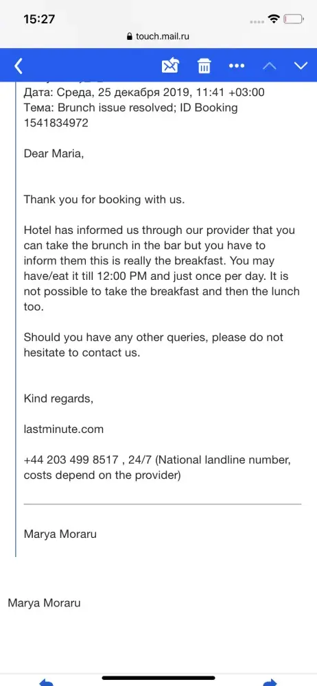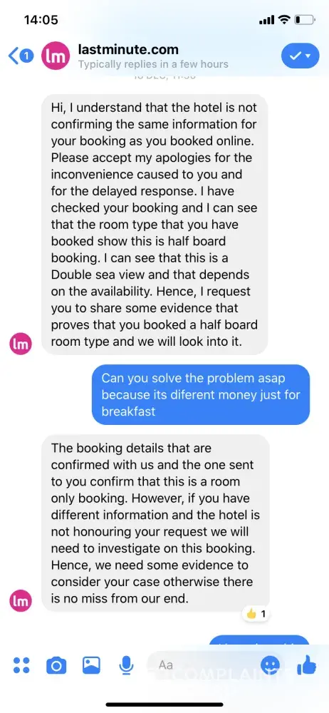 Hi i make a booking with lastminutes.com i pay for two persons to have half board meal and when we arrive to hotel the manager said that we pay for bed and breakfast. Its so awful i pay twice for one service . How can i receive money back i have no idea. First team said that i has half board and after that i pay for brunch and now they cal me and said everything is ok and all the time they tel me to wait 24 hours