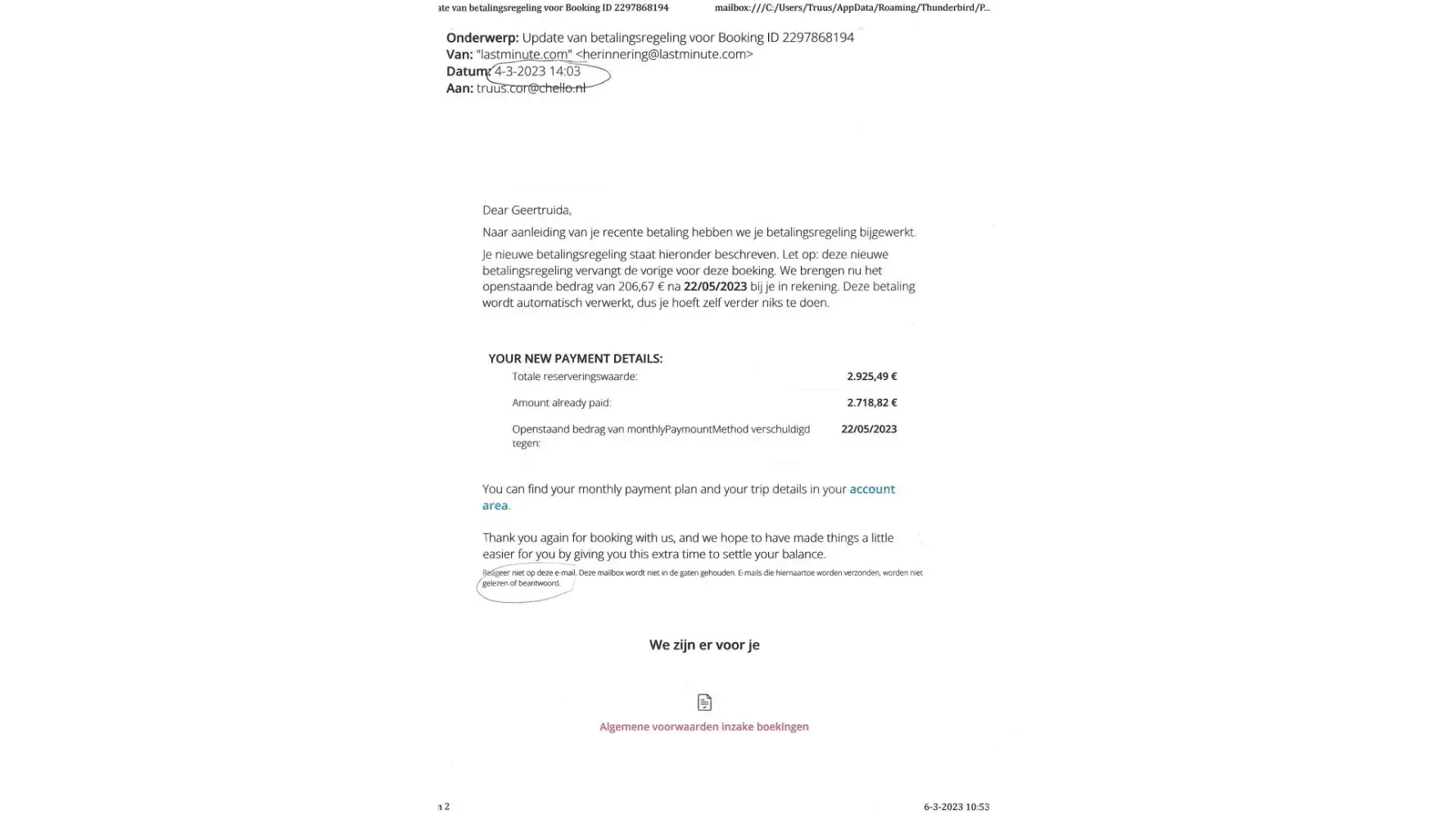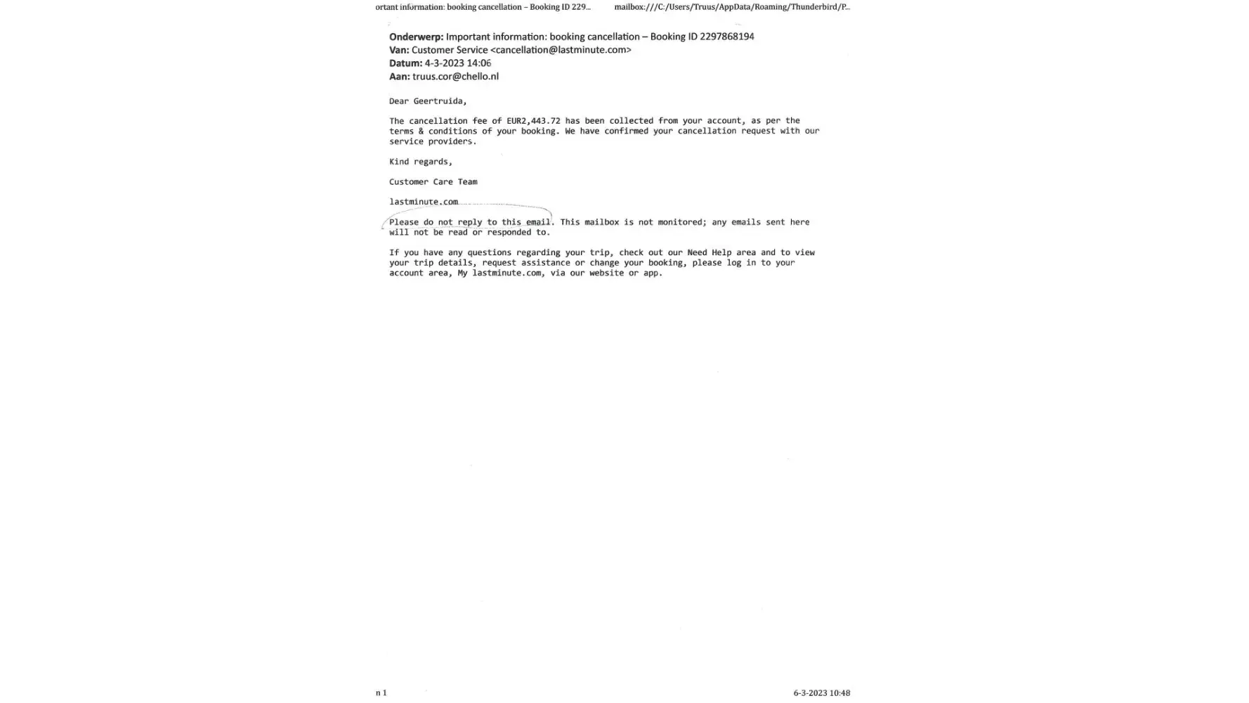 Because I was always unable to reach Lastminute.com, I was very surprised that I received an email immediately after my cancellation and even in the Dutch language stating that an amount of € 2443.72 had been collected. Together with the deposit of € 275.10, that is € 2718.82. They also intend to write off € 206.67 after 22 May, which together amounts to 2925.49. It was not possible to reply to this email.