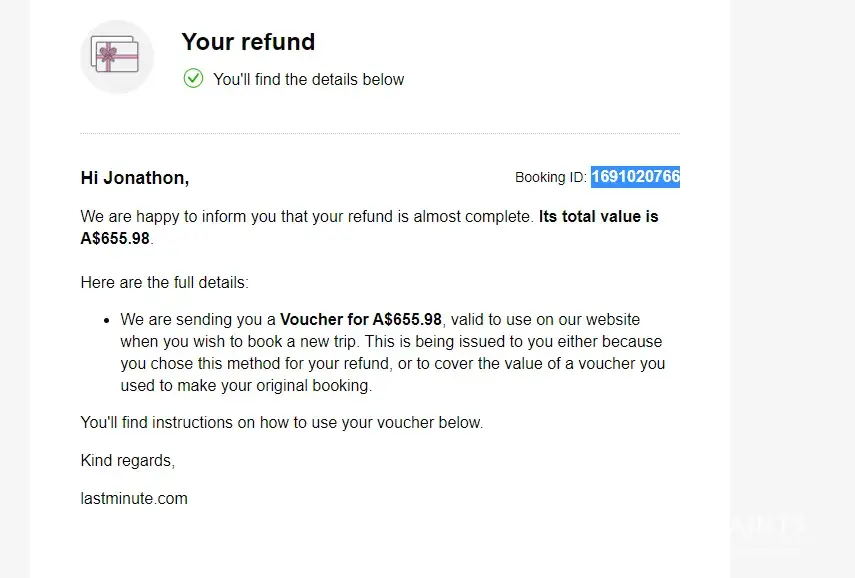 [protected]@hotmail.com so we can please organise the cash refund to my account. My booking ID is : [protected] and is for a total of $655.98.