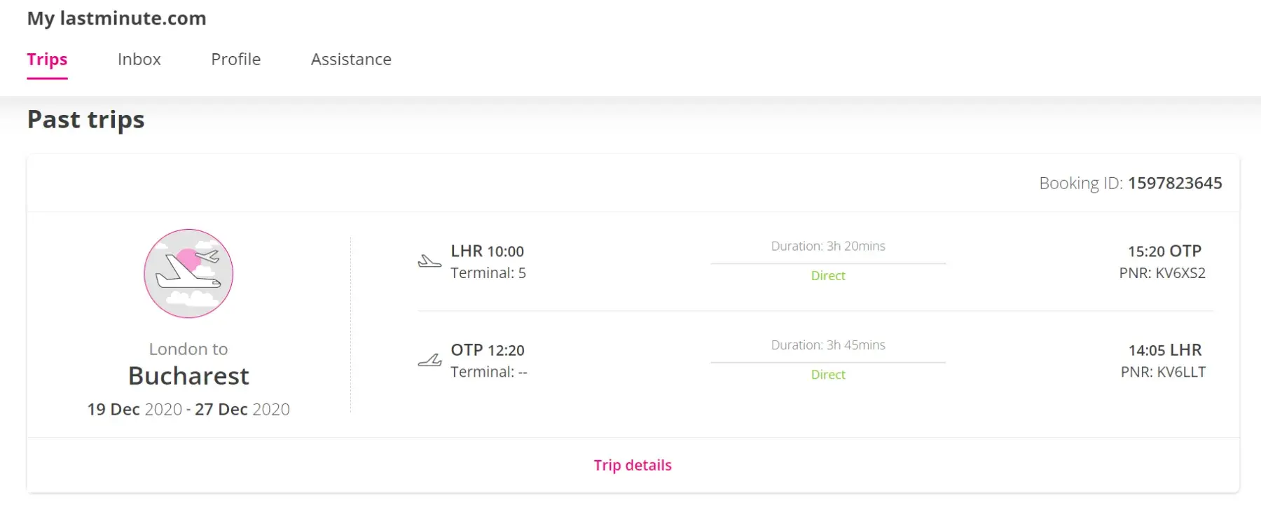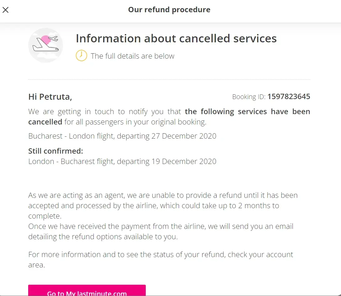 I had a flights booked via LastMinute for myself and two other family members to travel from London to Bucharest (leave Saturday 19 Dec 2020 and return - Sunday 27 Dec 2020). Booking ID: [protected] of a total cost of £539.44.