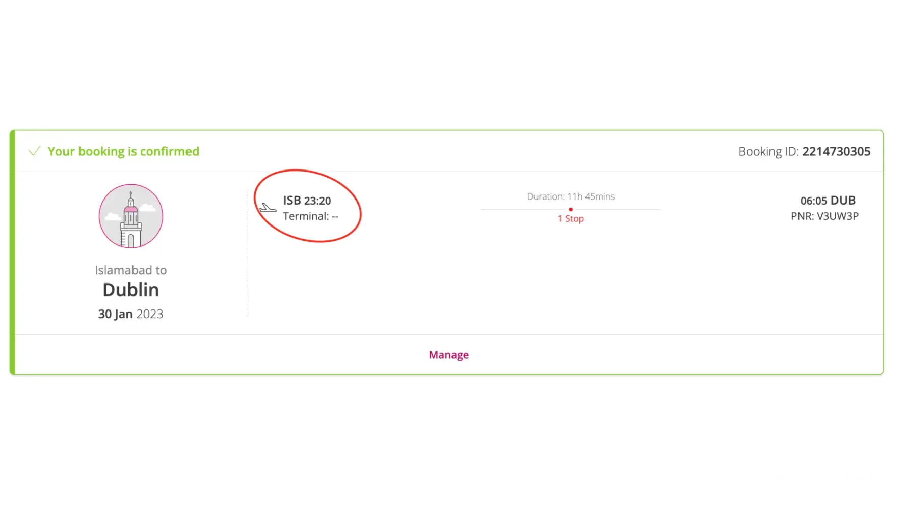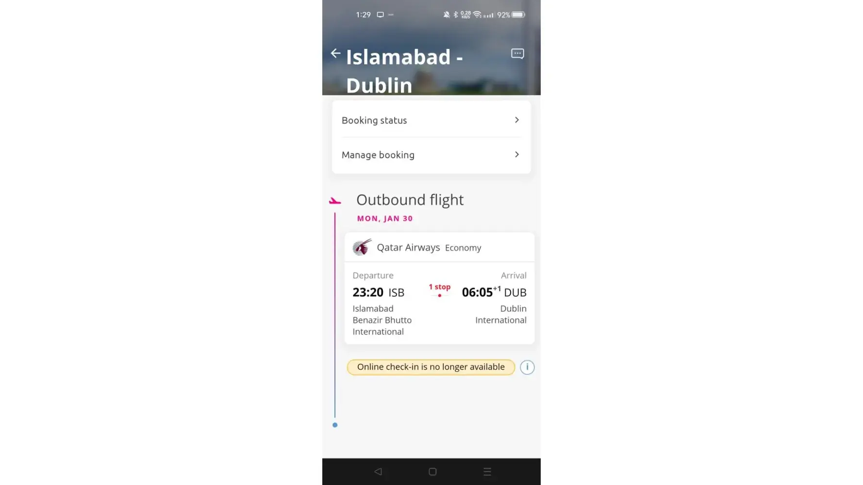 It's flight from Islamabad to Doha then I had connecting flight from Doha to Dublin, as I couldn't depart I have also missed my flight from Doha to Dublin.