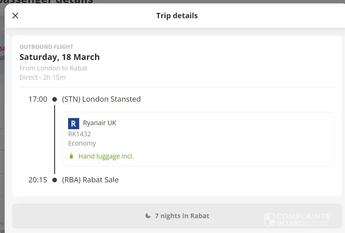 Then I made another request from London Stansted outbound on 18/03/2023 THIS TIME to (RBA) Rabat Sale (instead of TNG - Tangier Ibn Batouta as my previous booking}