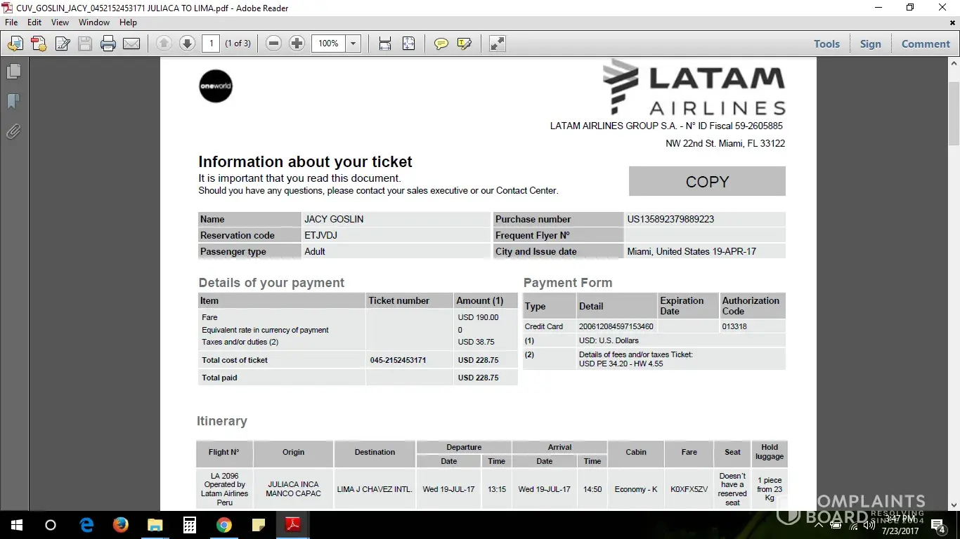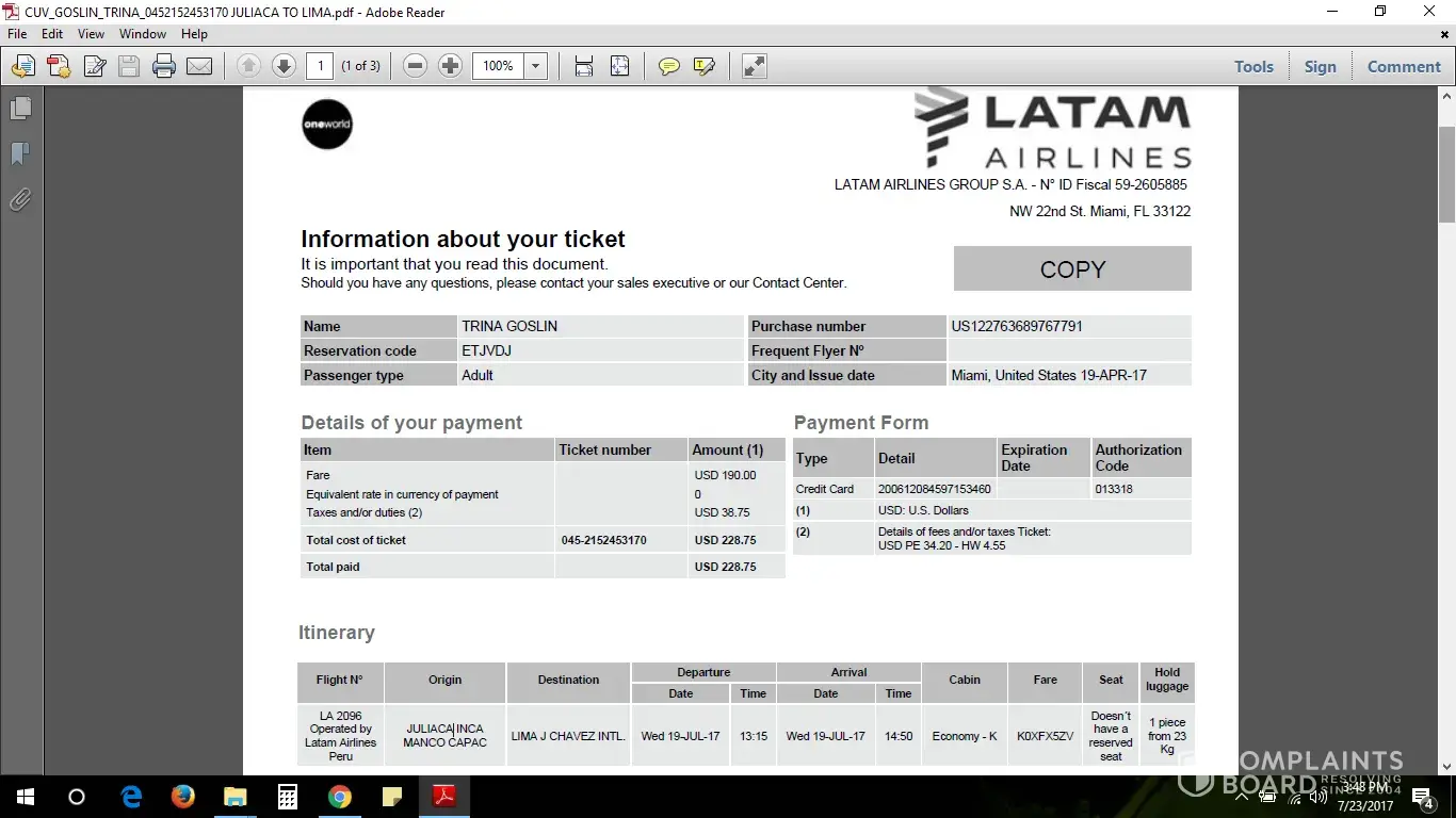 Our five original LATAM tickets to Lima from Juliarca were priced at US $228.75 each, or $1, 143.75 total, and our new tickets were priced at $305.16, or 1525.80.