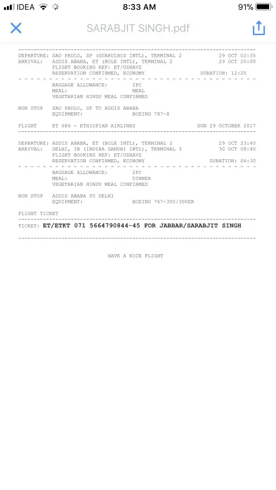 My self Sarabjit Singh Jabbar and my passport number is N5268607. I traveled with Ethiopian and latam airline from Delhi to Chile on dated 19/10/2017. My prime purpose was to come here to perform in the "seminaro de danzes Indo" and I was representing INDIA in this seminar, i was performing on 21/10/2017, but I am not able to perform in this seminar because my all costumes and the related stuff was in the baggage's that delayed by your airline .