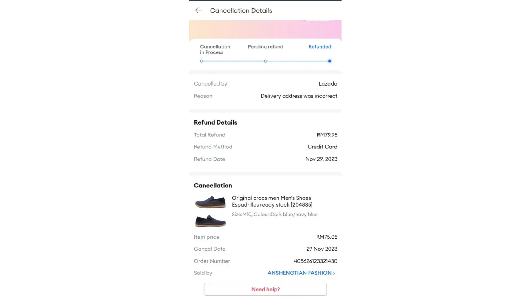 Package was returned via Flash Express the next day. Lazada received the return. The product sent was not what I ordered at all. Order was 8 shorts (4 colors) with pockets but received 2 underwear, not the shorts I ordered. So since Lazada return staff only saw the 2 underwear so they only refunded for 2 but not the other 6. So Lazada only authorized a partial refund. I notified the seller the same day that I received this package in error on Sept 13th with pictures of packaged, shipping label and contents. Supplier replied that same day that they would give me a refund! I have been in contact every day for 9 days with the supplier but they cannot understand the problem. Lazada own me a full refund for this order not a partial refund. Look forward to your reply.