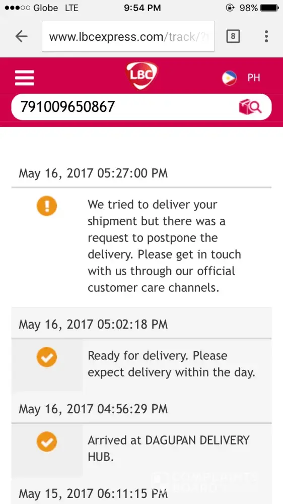 I want to complain po yung inorder ko na sabi sa lbcexpress tracking eh ngayon ko dapat matatanggap ang order ko galing lazada, around 5:02 when they updated me sa status ng tracking ko then 5:27 naman permission to postpone?!? Like What the hell is that site saying?!? I didn't receive or wala pumupunta dito ni isang LBC sa bahay then ganun nalang sasabihin sakin?!? Here's my trackig and you'll see it [protected] please ayusin nyo ang service nyo!