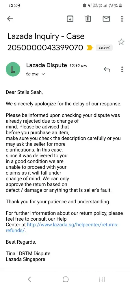 2) Lazada seems to have a platform for dispute management. But in practice, there is no effective communication/understanding as we are not able to click on a response or write email to the team, and they would eventually reject return for reason that buyer did not respond, though I have repeatedly called the call centre whenever I wasn't able to click reply.