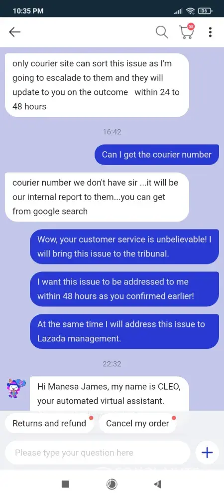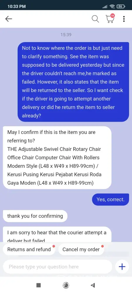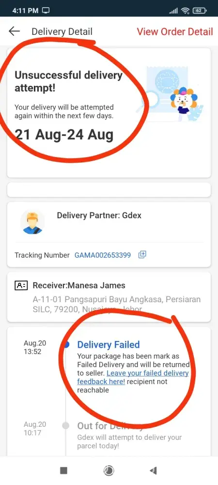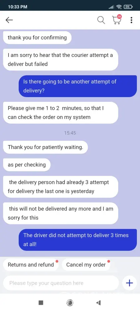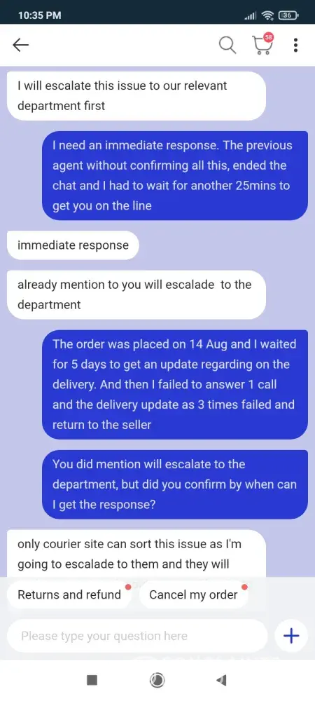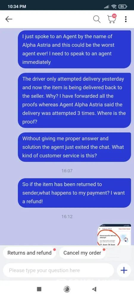 I made a purchase on Aug 14 (Order No: [protected]) and I suppose to receive the package by 21 - 24 Aug. On Aug 20 @ 10:31am, I received a SMS from GDExpress saying that a rider will be delivering my package on the same day, which is Aug 20. I received a call from the rider at 1:51pm but unfortunately the call was missed. However, I tried to call back the number and it was unreachable. So then later in the evening I checked the Lazada apps and discovered that the delivery was marked as failed and the package is being returned to the seller but at the top, it says that another delivery will be attempted in the next few days. On Aug 21, I reached out to Lazada live chat agent to get a some clarity on the delivery status and the 1st Agent by the name Alpha something told me that the courier tried to deliver the item to me 3times and exited the chat right after informing me this. And then I had to wait for another 25minutes to get another incompetent Agent, by the name of Prevena to tell me the same thing. So I sent Prevena the screenshots to proof that the delivery was only attempted once. She told me that she will escalate the issue to the related department and when I asked her when would I receive a response, she replied to me quite sarcastically saying that she have mentioned before in her first statement. And when I told her I want an immediate response, she asked me to call the courier company on my own and even had the audacity to ask me to Google the number! Come on, is this the standard of your customer service? If everything I need to do on my own, what is the need of Agents like Alpha or Prevena? They didn't clarify as to what will happen to the amount I've paid nor assisted in getting the number of the courier company. I am quite honestly mortified with the level of servitude of these Agents. I am hoping that someone takes this complaint seriously and train those Agents to be competent because I have been a loyal customer of Lazada for quite some time and have spent alot in this platform. When I experience this kind of attitude, I just feel like giving up and am on the verge of taking my business elsewhere.