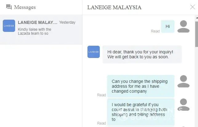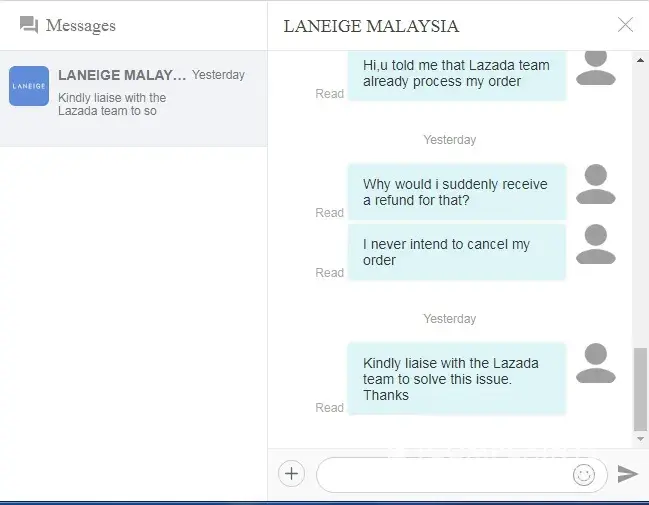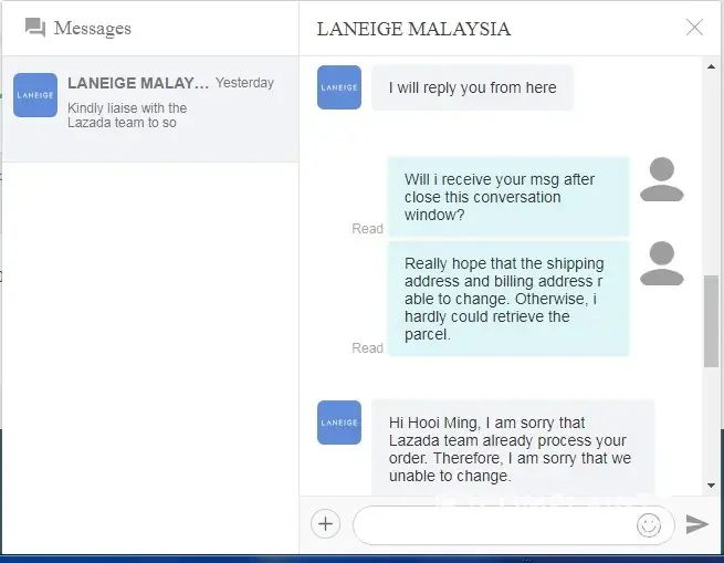I have ordered an item from Laneigh Malaysia whereby the order number is #[protected]. Later on, I make a request for a change of shipping and billing address to Laneigh Malaysia whereby the Laneigh Malaysia rejected my request and told me that the item have been packed and sent. Hence, I'm expecting the parcel would be sending to the said shipping address and had arranged my friend to receive it. However, I received an email from Lazada Malaysia on the next day informed me that the item has been cancelled and refund process initiated. I'm so upset with it and make enquiries towards both Lazada Malaysia team and Laneigh Malaysia. The explanation given by Lazada Malaysia team was that the order being cancelled was due to shipping delay and can't arrive in expected date. I reverted to their message and stated that I don't mind to receive the parcel late. I also raised the question on the explanation given by them was contradicting with what Laneigh Malaysia given me previously. At the same time, I send a message to Laneigh Malaysia hoping they could resolve the said issue with Lazada Malaysia. No response from them. This is the worst e-shopping experience I ever had. I never want a refund but to get the product which I have purchased.