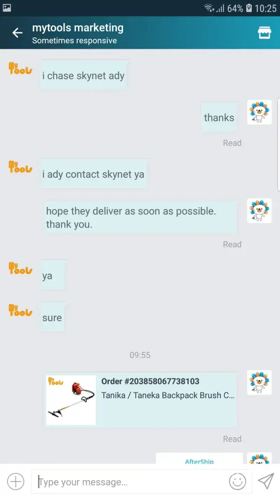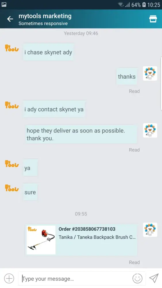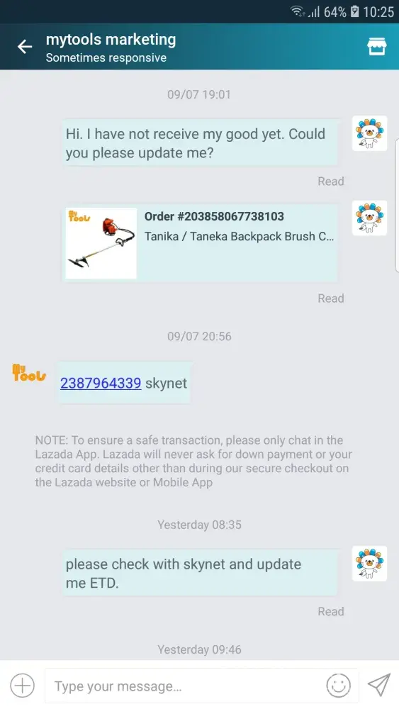Estimated Time Delivery shown as Sat 07 Jul - Mon 09 Jul. I have been following up with the Seller (mytools marketing) since 09 Jul.