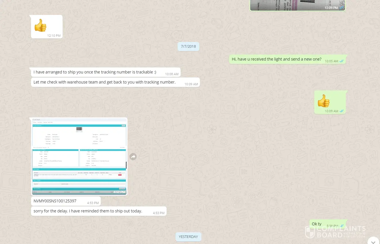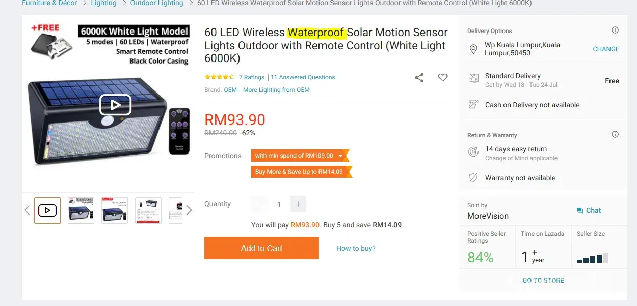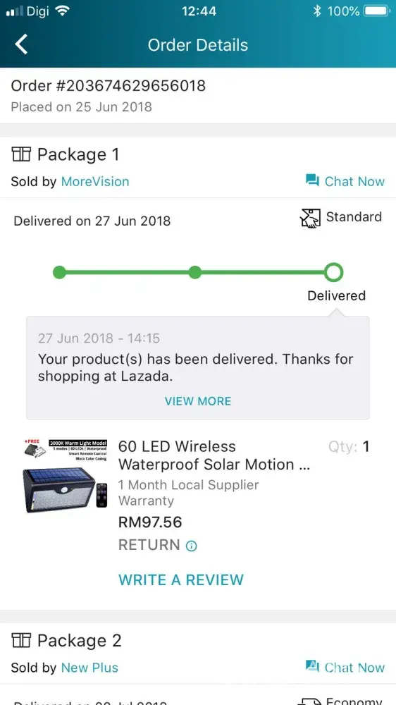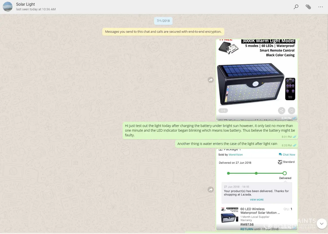 Hi, I have bought a waterproof solar light (order no: #[protected]) from MoreVision and received on 29 June 2018 and began to test out the light under mode 3 (which claim to be lighting up for 6-8 hours) on 1 July 2018 after full charge under direct sunlight. The light couldnt even light up for more than one minute and the LED indicator started to blink which means low battery so I request the seller, MoreVision to replace a new one. Fortunately, MoreVision allow me to return the faulty product after I provide them some videos and photos as a proof of the defective product. The product is returned to the address: No.12A, Jalan Cendana, Taman Rimba, 28400 Mentakab, Pahang provided by MoreVision on 2 July 2018.