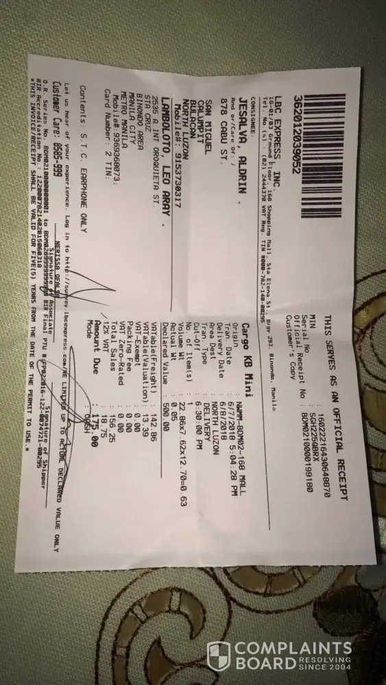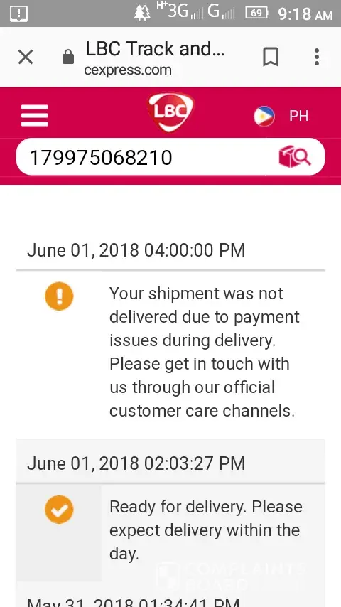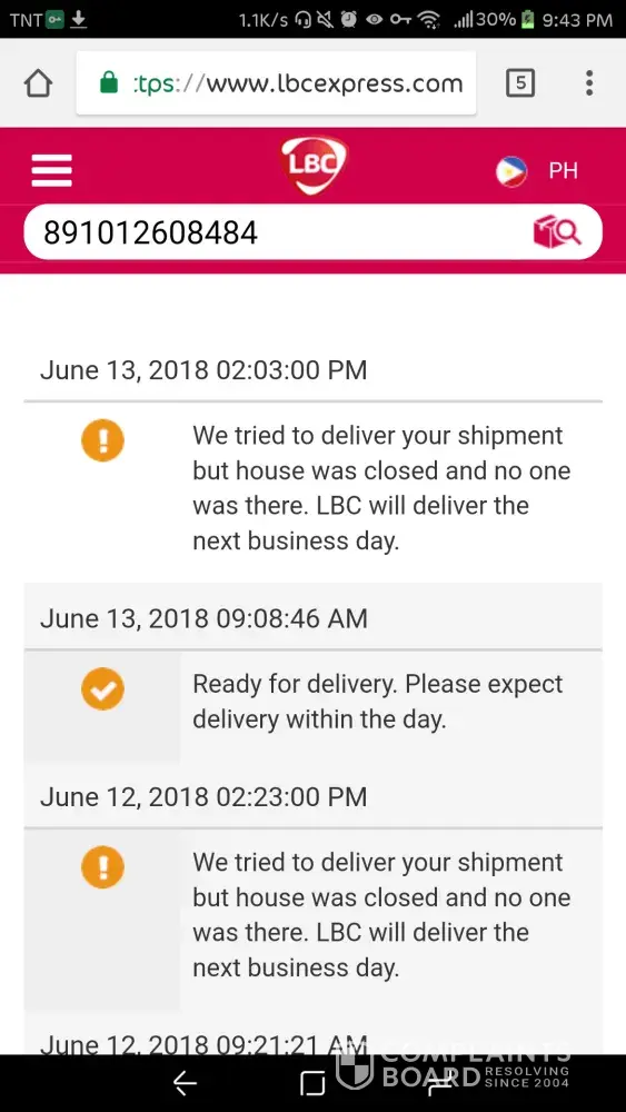 LBC Express i'm complaining about my parcel na hindi deniliver ng inyong delivery man.