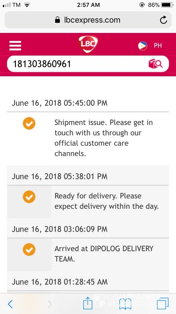 My parcel was ready for delivery last June 16, then 15 mins after that they update that there's a shipment issue and we should get in touch with their official customer care. What gives? Can they not specify what the issue is, or can't they just contact us through the provided contact number upon shipment? Isnt that the point of us giving them that info? We will be complaining about this afternoon at the nearest lbc branch. I hope you improve your service but if you can't, please stop claiming that your the hari ng padala. Such bull!