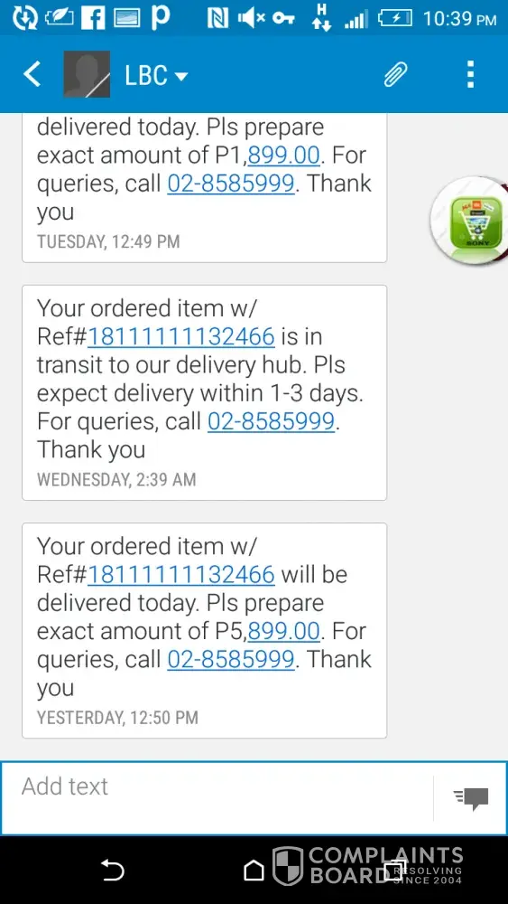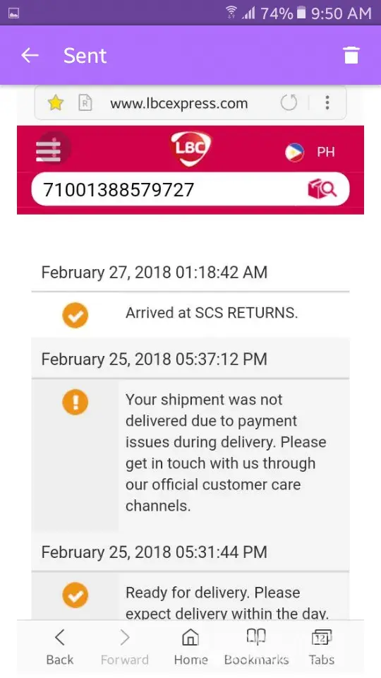 "pen no payment" was posted on sunday, feb. 25. It pissed me off because the item was in fact not delivered that even date! For further clarification, I called lbc cust care hotline [protected] to verify the veracity of said posting, vis a vis defend my side. It was clarified that there was no delivery because it was a sunday and I was advised to wait for its delivery instead.