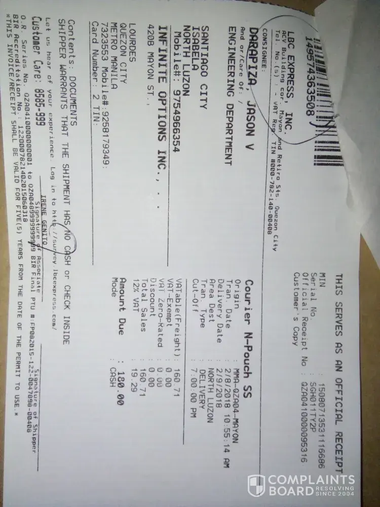 Please make an action about your branch in cainta rizal. It was shipped by lbc marikina last feb 28. The package has arrived on march 1 in cainta del team but until now, it has not reached the consignee. Please solve this immediately. The consignee is very angry. I would like to have an apology to the consignee because she is my customer. This will make my business to have a bad image. Please deliver her product now.
