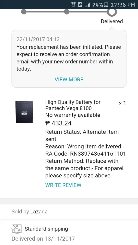 Goodafternoon. Nag order kasi ako sa lazada ng battery worth 475. So dumating sa bahay, hnd battery so hnd kasi ako ang nagrecieve kasi nasa work ako kaya nag iwan nlang ako pambayad, pag uwi ko after work. Hnd siya battery proof casing sya. 100pesos sa kanto kanto. Kaya nagulat ako so pinapalitan ko siya thru LBC kasi wrong item. This time my nagtex na darating na ung deliver ko expect konv tama na un. Nasa work ako kaya ung mother ko ang nagrecieved. mali nnman ung dumating inexpect ko na tama na ung dadating, pero ang dumating headset. Kaya sobra na ung galit ko sa inyo. Mali mali kayo magdeliver. Pabalik balik ako sa lBC para magpapalit. Nasasayang ung oras ko sa inyo dahil sa mali na produktong binibigay nyo. Kung hnd nyo maibigay ung tamang produkto ibalik nyo nlang ung binyad ko. Nakakasira kayo ng araw!