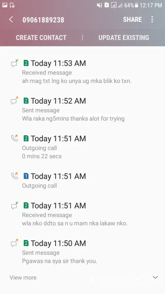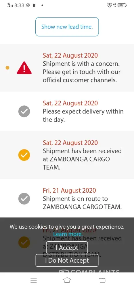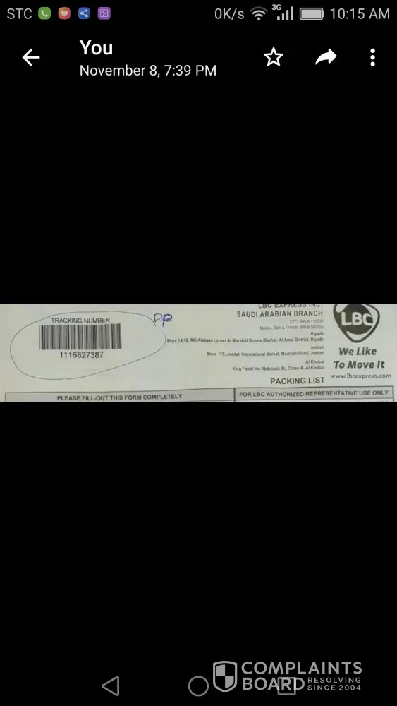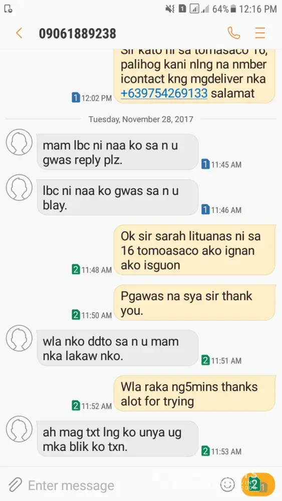 First, yung shipment ko with tracking # [protected], I send this sa LBC Iznart, Iloilo Branch, naka receive ako ng message 7:28pm na nareceive na dw ni L GOMEZ ang shipment ko, November 2, 2017. November 6, tumawag ang officemate ko asking kung nasaan na daw ang documents. I was confused kasi akala ko na receive na nila, but they don't have staff there na L. GOMEZ. So, ayaw kong maniwala pinacheck ko sa reception and sa guards. Wala. While we are talking sa phone, my officemate and I, yun na din ang time na dumating yung shipment ko delivered by your staff. I will attach to this letter screenshots as evidence. So what does that text message from LBC means? Bakit magtetext na receive na, ngunit yung totoo hindi pa pala? Please do something about this kasi how can I trust you kung pinagsisinungalingan lang naman kaming mga costumers?
