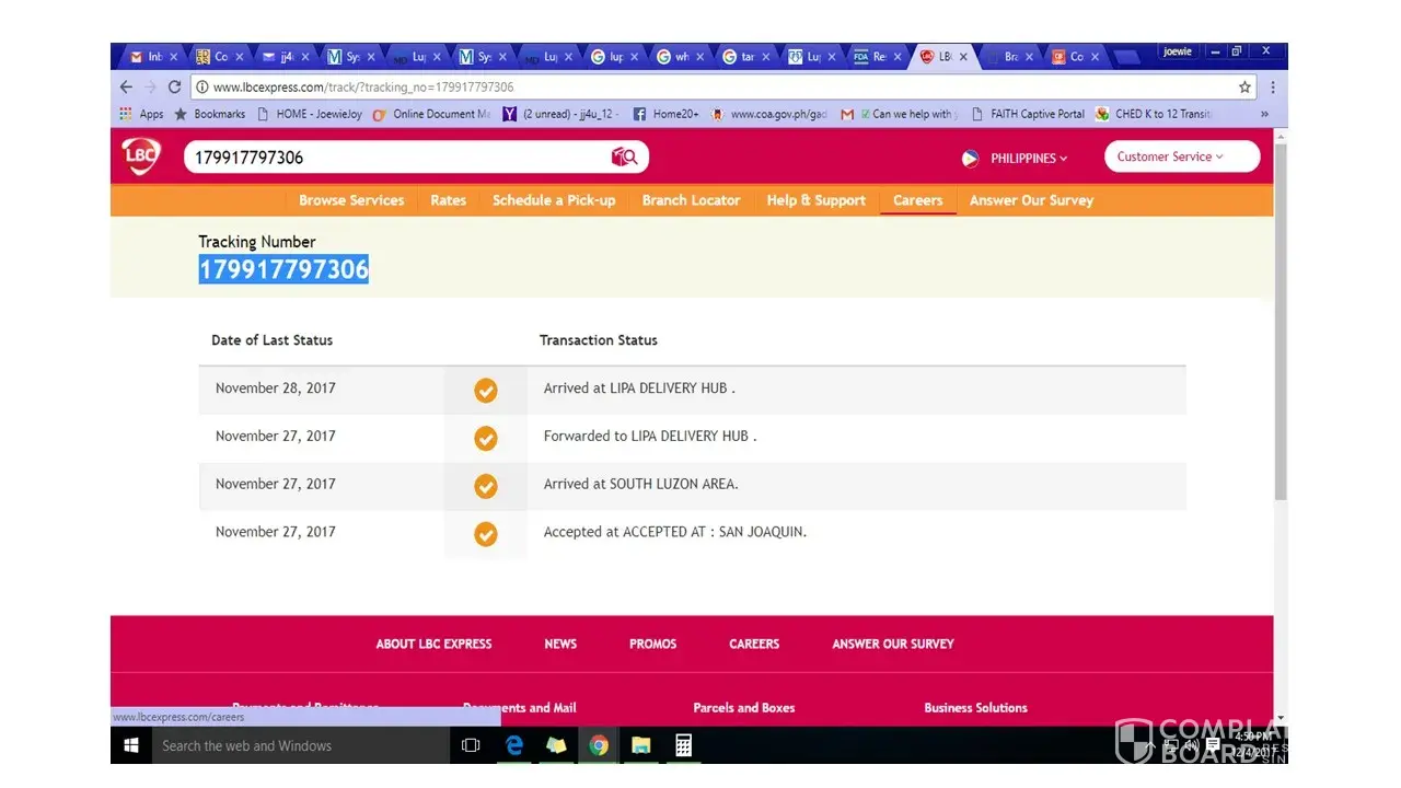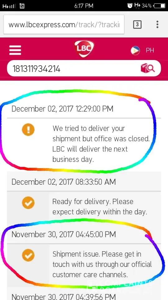 And today it said "We tried to deliver your shipment but office was closed. LBC will deliver the next business day." (December 02, 2017 12:29:00 PM)