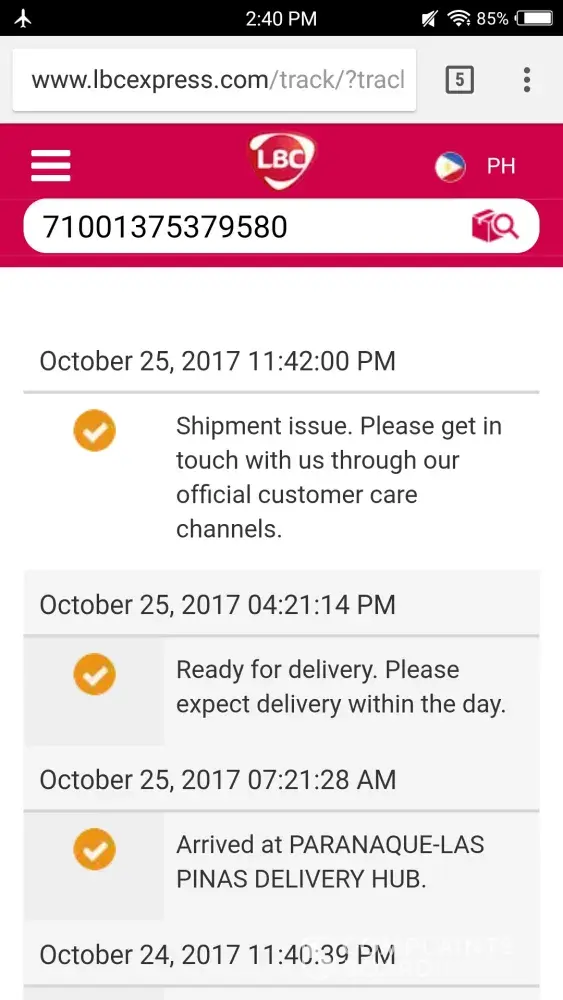 This is the first time na nangyari to sakin, kasi pag nagshop ako sa lazada they will inform me na dadating na yung package and best part is tatawag pa sila pag malapit na. Yubg delivery niyo LBC may nagmemesage naman na dadating na, twice na 2 days ko ng iniintay pero hanggang ngayon wala pa. Nakakaabala lang kasi, nagwowwork ka tas nakikipasuyo kana lang bg pag iiwanan tapos wala pa. Trinack ko yung package ko 10:00 am kasi LBC texted me at 9:23 am, nubg asa website niyo na ako 9:10 am your package will be delivered then 9:36 am shipment issue na. Please paki resolve kasi the sum of money we're paying is pinaghirapan yun, and yung abala din. Thank you.