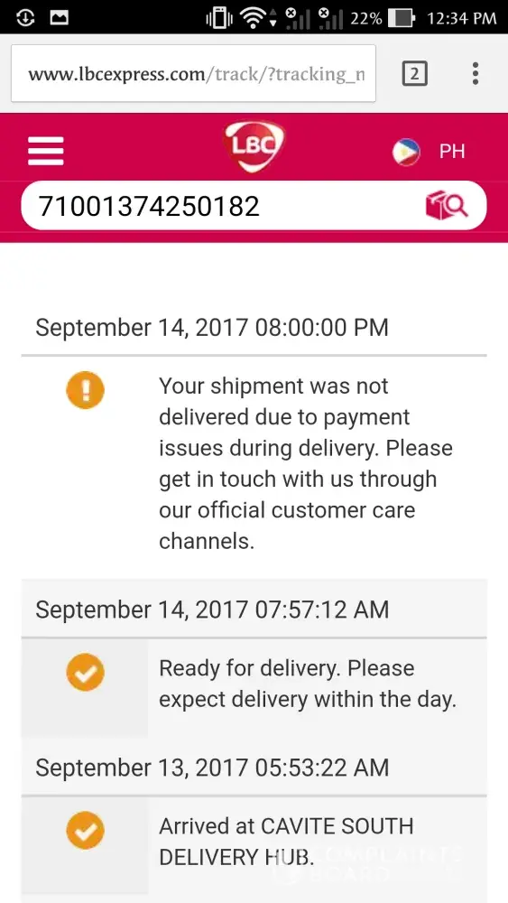 Nag order ako ng 32gb na sd card nung September 9, 2017. Ang expected day ng delivery ko ay September 17 pa pero bakit Failed ang Delivery Status(NON DELIVERY)? Wala namang kumontak sakin na taga LBC kung kailan dadating ang package ko tapos biglang nag failed? Gusto ko malaman kung anong nangyari kasi everyday ako nagchecheck ng logistics para matrack kung ano na ang nangyayari sa delivery. Wala namang dumadating na delivery boy sa bahay namin para masabing kaya nagfailed ang delivery eh dahil sa wala ako sa bahay and isa pa walang nagnonotify sa akin kung dadating na ba ang package dahil nga sep 17 pa ang expected day ng delivery. Gawan niyo naman ng paraan to LBC! NGAYON KO LANG NAEXPERIENCE NA GANITO YUNG NANGYARI SA INORDER KO! KUNG ALAM KO LANG DI NA SANA AKO NAGORDER! Ito yung tracking number ko [protected]-XJUV.