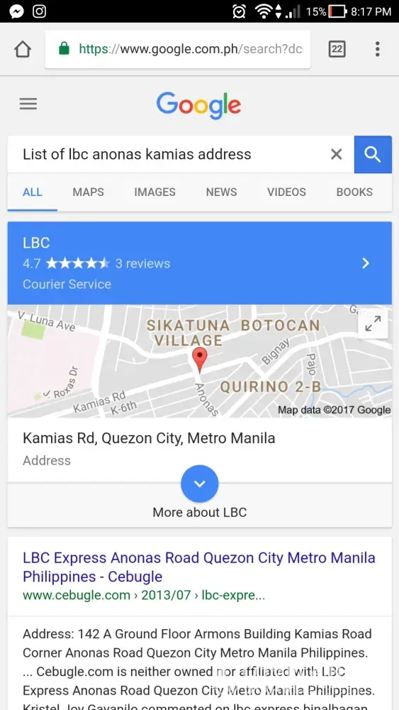 I sent an important letter to my dad through LBC yesterday september 4 2017 in Gusa, Cagayan de oro city to anonas kamias quezon city metro manila. Then the girl told me named Sandy Dumago that she cannot see the address through her computer. How come? So i've been struggling to find the exact address in google. So while i was searching the google if what should be the exact address. I didnt even know she was click wrong address which is WEST KAMIAS. When she dictate it she told me that Kamias Rd quezon city metro manila so iwas confident that it was right. Well i didnt even review the paper because i was in a rush.