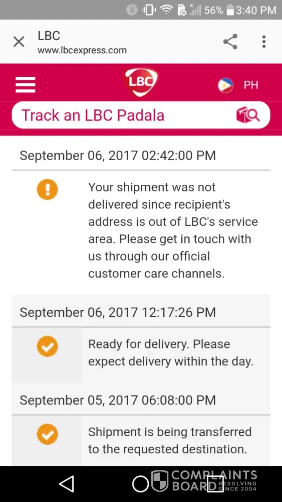"September 05, 2017 Shipment was not delivered since recipient's address is out of LBC's service area."
