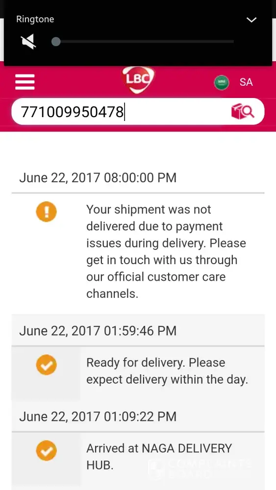 I ordered a JBL earphones at Lazada, and when it was forwarded to LBC I've been tracking the package, I expect the package to arrive on the 23rd of June, but 22nd of June it's already in Naga and was ready for delivery within the day. ok so I waited that day, I was kinda of surprised that it's going to be delivered a day before the expected delivery, but no package has arrived. So I waited the next day 23rd which is the said expected day to arrive. Again, no package has arrived. I was shocked when I checked the tracking page of LBC that says "Your shipment was not delivered due to payment issues during delivery. Please get in touch with us through our official customer care channels" like hello I've waited but there's no delivery, and now I'd get to find out that it wasn't delivered due to payment issues? What are you kidding me? This is my tracking no. [protected] get this sorted.