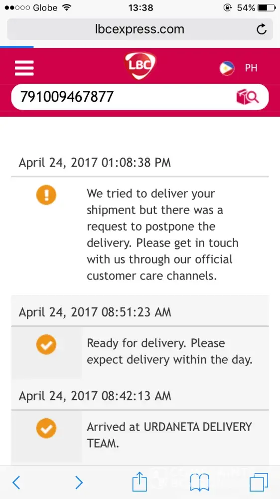 I sent my items last April 10, 2017 and it was printed on the receipt that it will be delivered on April 13, 2017. I know there will be a delay on delivery due to Holy Week but my concern is it's already May and still my items were not delivered. I have already went to LBC Shopwise Mambaling and ask them to have it delivered to Brgy 53 Rioeng. My items were still in Tuguegarao Delivery Hub.