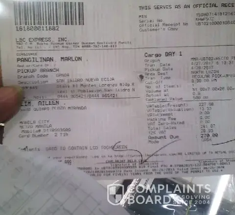 I have a parcel from Quiapo Manila to be pick up at San Isidro branch in Nueva Ecija. It was process on April 27, 2017 and its scheduled pickup written in the receipt was on April 28. I did not track the parcel because I'm expecting with the date that written in the receipt. Today April 29, I went to lbc San Isidro Nueva Ecija branch and my parcel was not there. The representative in lbc told me that the parcel was not yet received by the Cabanatuan branch and and then he tracked and he told me that that's the information he can gave because I told him that it was suppose to be yesterday. So nothing i can do just to be wait. I suggested that if there is a delay in delivering parcels they should inform us, your customers Our phone numbers are there in the receipt. So easy to call or send message for the delays.I complain now because this is not the first time it will happened it always happens to me. I will send the copy of the receipt. I hope you will fix that kind of situation. I have many things and work to do and its getting me angry because I paid the right amount and I deserve good service. Now I tracked the parcel and I think I will get it later. thank you.
