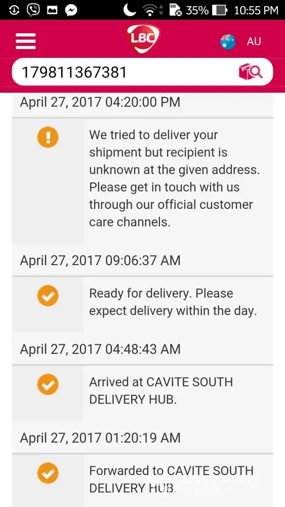 I have a delivery waiting. It was shipped to my address on April 26 which is on Wednesday. Until now, It wasn't delivered here. And then, I saw a picture taken from the sender of my package. In the receipt, nagka-typo ang LBC. instead of typing "Town n Country" ang nakalagay ay "Toen n Counting" nagworry na ko. I tracked it na using lbc website, and it said na "We tried to deliver your shipment but recipient is unknown at the given address." at ang latest na track info ay "Your shipment is ready for claiming cavite south delivery hub." I tried searching on that hub, but madaming branches ang lumabas ofcourse. so hindi ko po alam kung alin ang pupuntahan. Hindi ba pwedeng ideliver ulit sa mismong address? tutal, LBC naman ang nagkamali ng pagkakatype sa receipt. There is also another picture sent to me, na ung sulat ng sender ng address ko ay Town n Country, which is tama. So ang LBC talaga ang may mali.