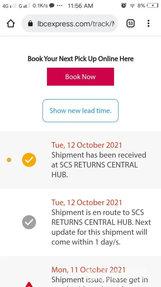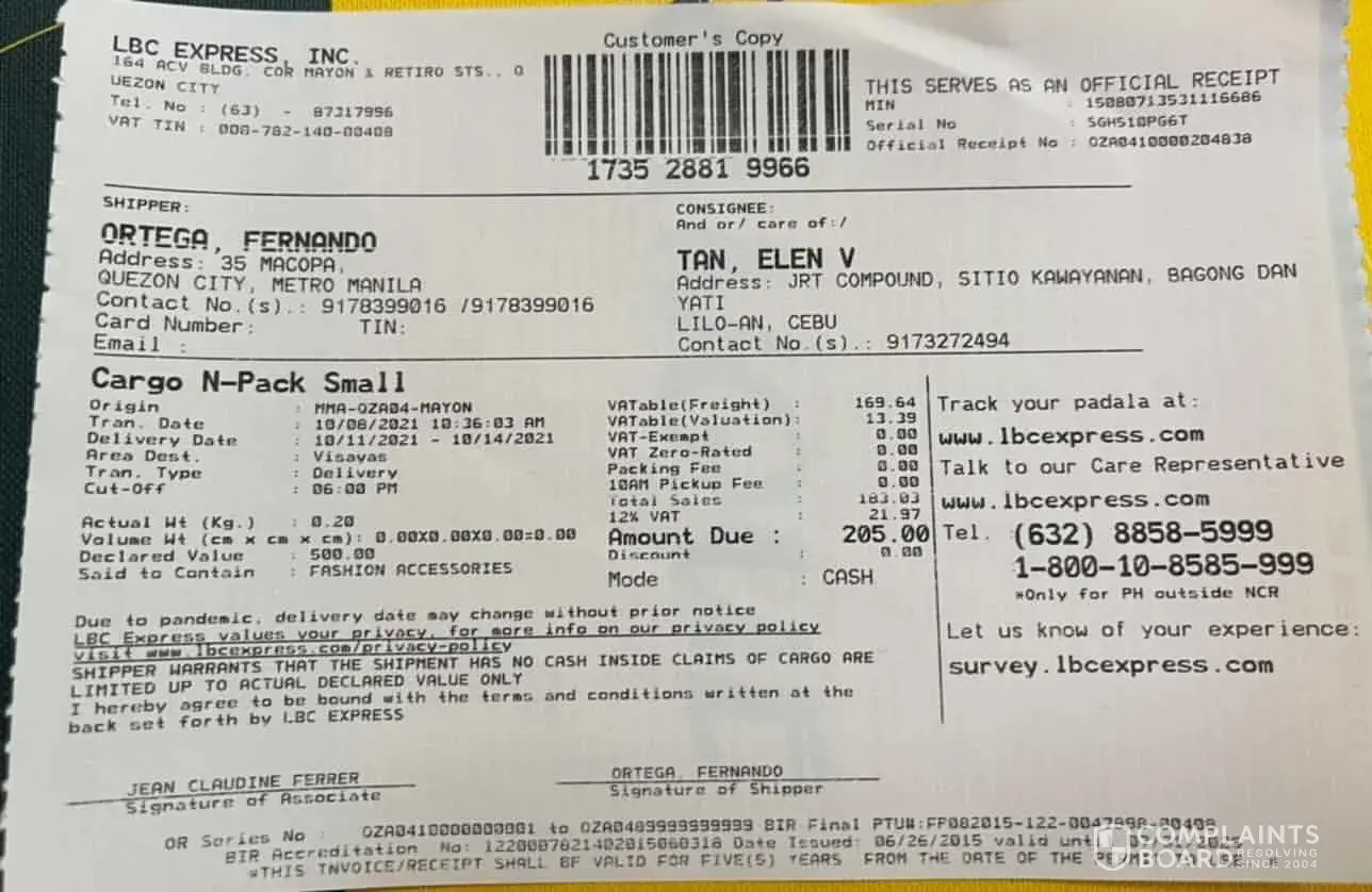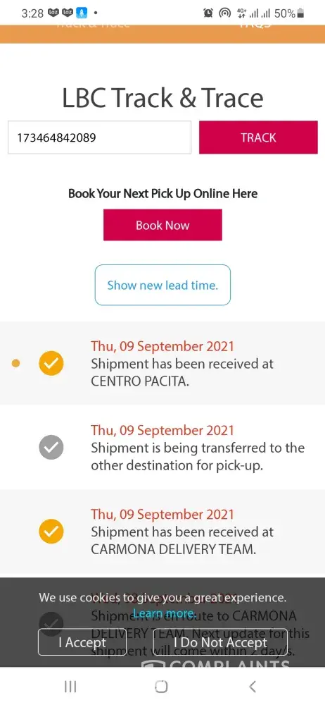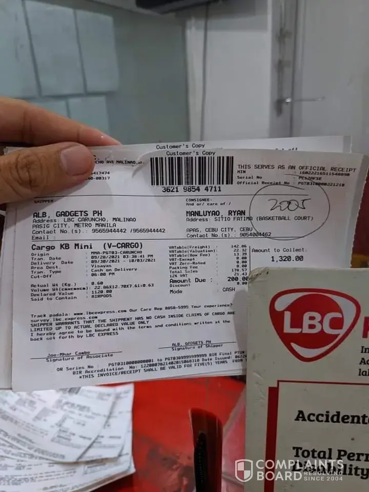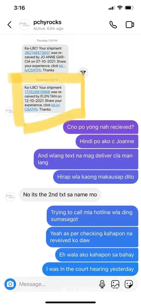 October 12, 2021 i left home at 1:00 pm to accompany and attend the court hearing of my niece in Mandaue trial court. I arrived home around 8:00pm already. In the midnight before I slept i tried checking and there I saw the tracking record and confirmation that it was DELIVERED to me 10/12/2021. This morning I asked our compound if there was any delivery made yesterday for me - NONE. Although it is very unusual that they will say DELIVERED without even texting me or calling me re: delivery of LBC on the way. They even texted confirmation to the shipper at 4:20pm yesterday that item has been delivered to me? REally? To whom? Can your personnel show proof of who received it?