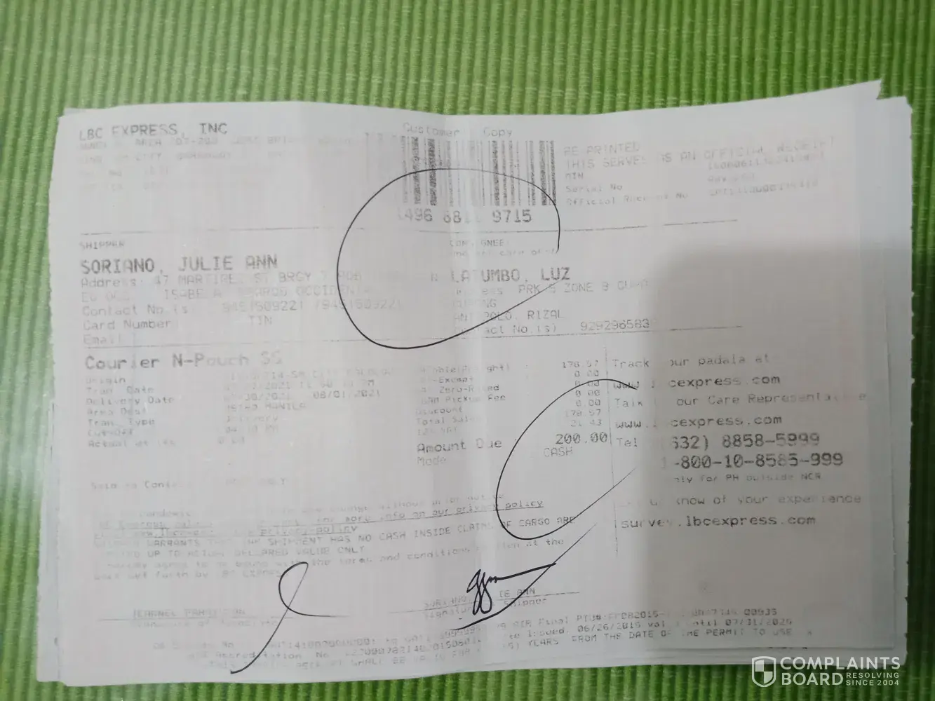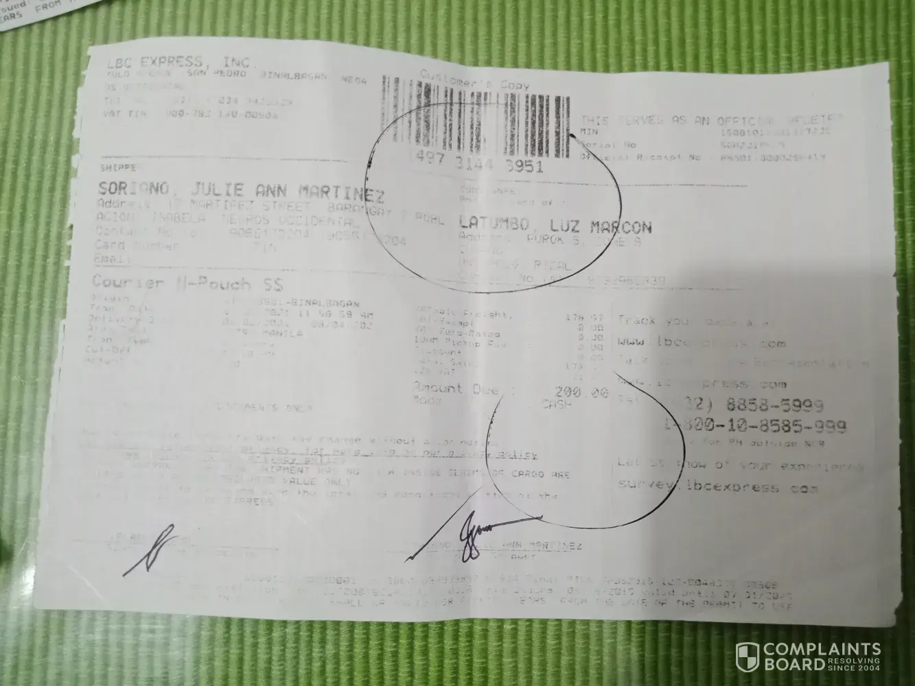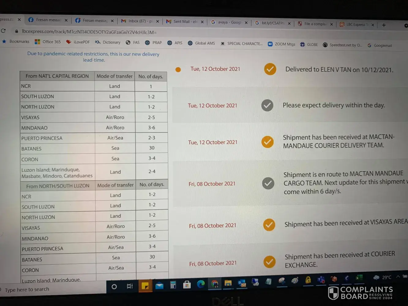 October 12, 2021 i left home at 1:00 pm to accompany and attend the court hearing of my niece in Mandaue trial court. I arrived home around 8:00pm already. In the midnight before I slept i tried checking and there I saw the tracking record and confirmation that it was DELIVERED to me 10/12/2021. This morning I asked our compound if there was any delivery made yesterday for me - NONE. Although it is very unusual that they will say DELIVERED without even texting me or calling me re: delivery of LBC on the way. They even texted confirmation to the shipper at 4:20pm yesterday that item has been delivered to me? REally? To whom? Can your personnel show proof of who received it?