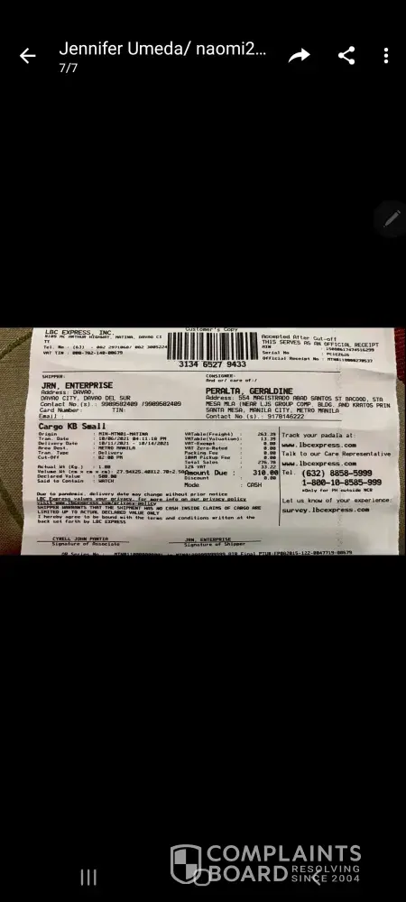 I did all means to contact your support number, hotline #, local LBC numbers here in Cebu/Liloan (the one who usually delivers to me if I have LBC delivery) unfortunately cannot contact your teams. I sent an email earlier too to your customercare email on my claim but no idea if that can be read as well. That's why I reached out to my shipper and asked for her assistance to reach out to LBC and be heard.