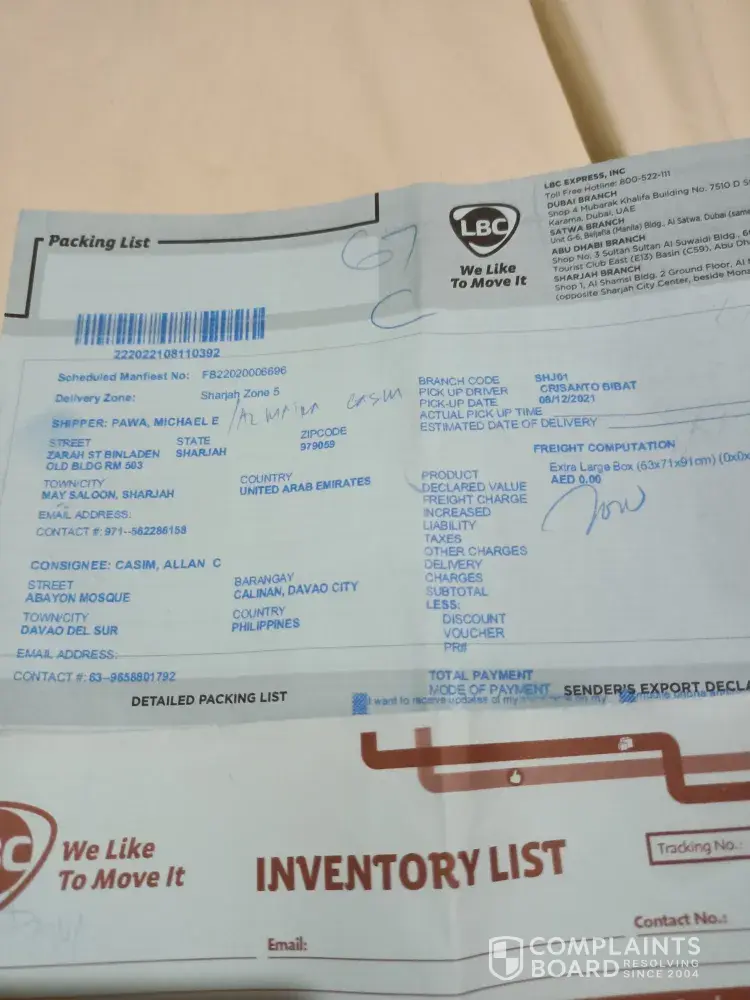 Please let me know regarding my last box.. I've sent 4 boxes from Sharjah UAE last August 12. 2021 the 3 boxes already received but 1 box left still no sign of delivering... here's the transaction# [protected]...I've sending boxes from lbc 10 years and this is my first time encounter like this..hope you can solve this problem...hoping for your kind consideration...