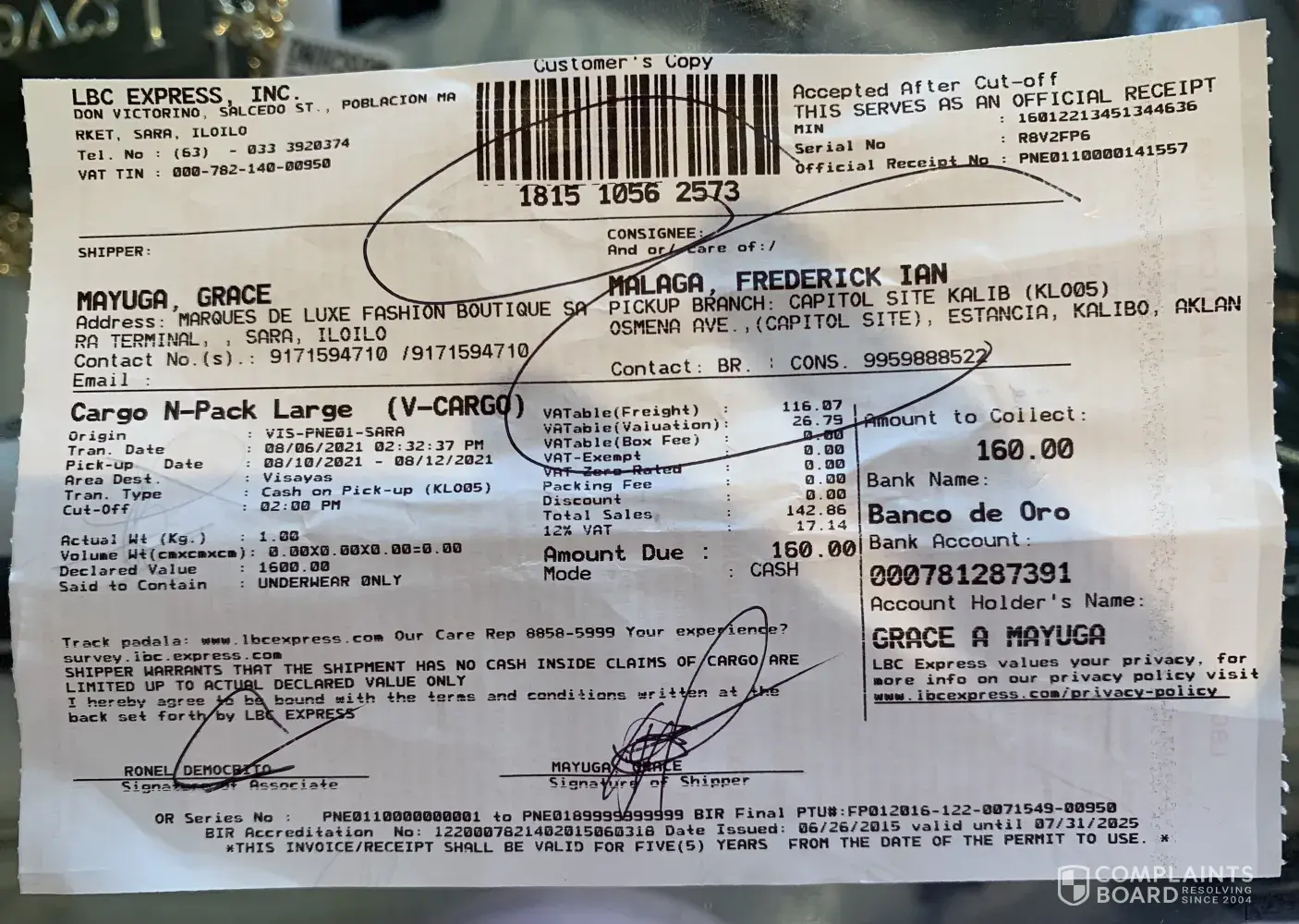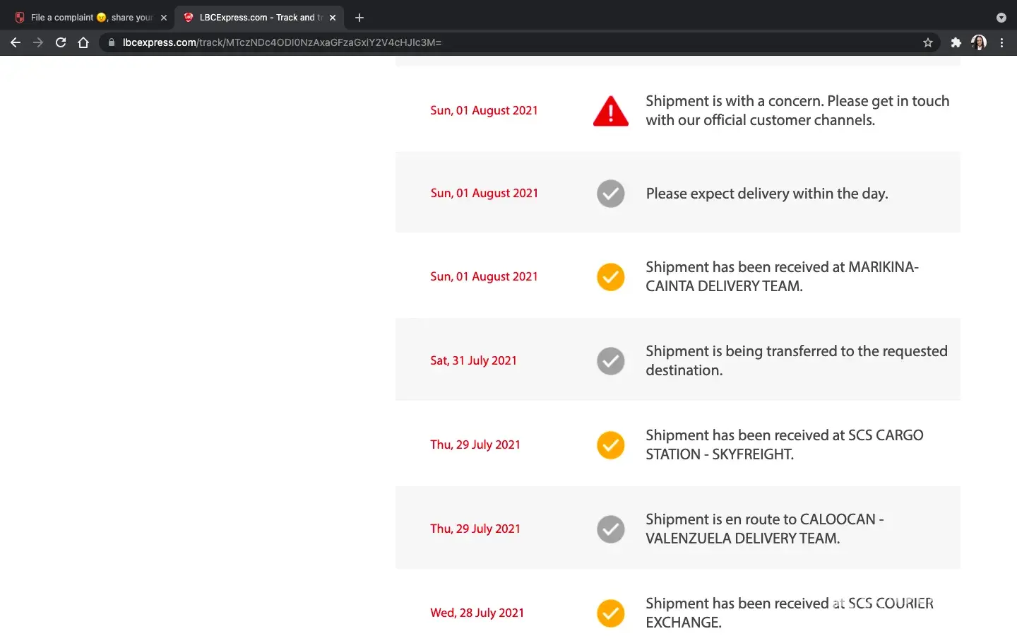 1. Shipment not received on stated date - At around 2:04pm on Aug 4, 2021, I received a call from family member from Dipolog city informing me that the shipment with tracking no. [protected] was not received. LBC Dipolog City branch informed her that shipment was still in Cebu. Transaction date was on July 29, 2021 at 12:43:36pm. Expected delivery date is 08/02/2021-08/04/2021.