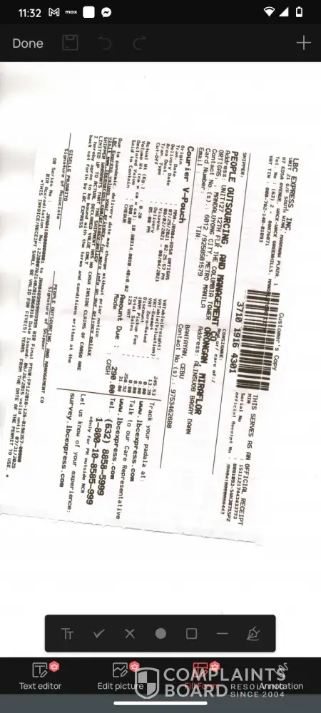 2. Poor customer service - called LBC Mandaue to ask for help about the status of my shipment but nobody answered my call. All 24 phone calls from 2:13pm to 3:39pm were not picked up. Decided to go to LBC Gaisano Grand mall, Liloan, Cebu to personally verify the status of my shipment. On my way, I continued to dial LBC Mandaue office, still didn't answer. Since, I was not satisfied with my verification with LBC Liloan branch I have to drive about 10km to Mandaue City to personally see them instead of just having the verification over the phone. In Mandaue office, I was not entertained well at first but was referred to their supervisor. They gave me his number for me to call but he did not answer all my 8 call attempts. I was entertained well later on by a front desk personnel after many frustrating attempts.