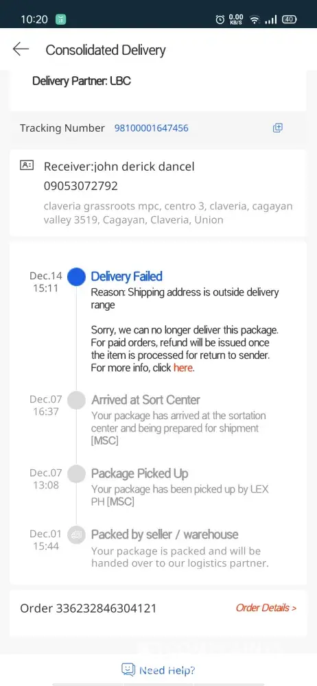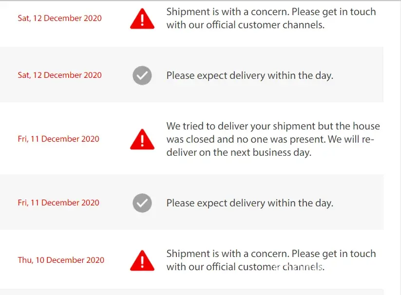 This was sent out on the 9th of December, 2020.. No updates, I was the one who reached out to them since there's no news even though it's beyond the ETA.. When I contacted their CS, I was told that they can't locate my address.. Seriously? I even received my other parcels from different courier services.. There's no SMS nor any calls received as well.. As of this writing, still no help from them.. I even asked if there's an assurance that I will receive the item but they did not give me any answers.. This is really alarming..