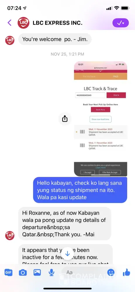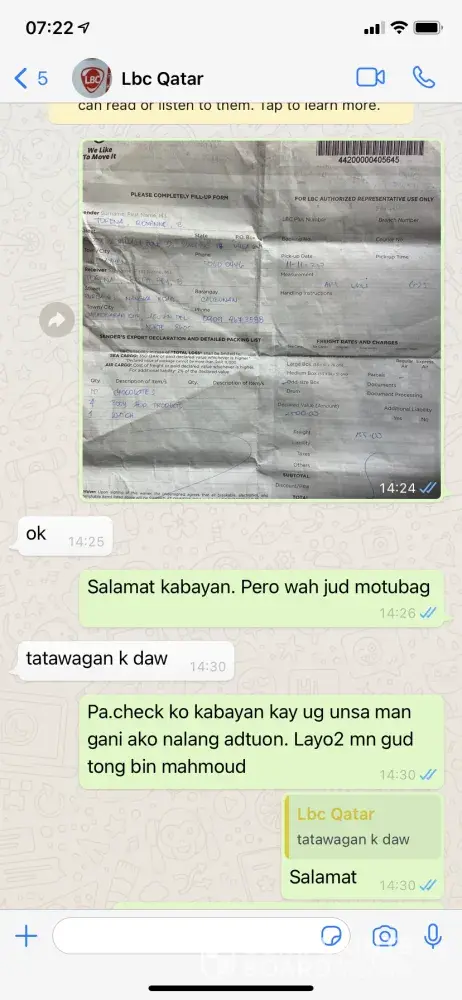 I wanted to express my great disappointment with LBC. November 11, 2020 I personally brought my items to LBC main branch here in Qatar for Aircargo. I was then informed that the next schedule for shipping is on November 14 to Philippines. November 25, I expected that my balik bayan box already arrived in the Philippines but upon tracking my box to my disappointment, the shipment status is showing "Nov 11 shipment is accepted". So then I called every numbers I know that's linked to the branch here in Qatar, I even contacted through the fb account. "Ang tagal nilang makontak" and then to find out that my parcel is indeed still in the branch due to the new customs policy. "Wala man lang pasabi sa akin". Fast forward, finally in the evening that day someone contacted me and then able to submit the requirements on November 26, 2020. Few days later I then received that my shipment will be expected to arrive on December 7, 2020. Today, December 17, 2020 my shipment status is still showing "December 10 en route to Butuan". And to my biggest disappointment, I was informed that they don't still have update yet since my Aircargo box was being shipped via RORO - sea transportation. Didn't I pay for Aircargo for faster shipping? Very disappointed that I have to keep on tracking and asking LBC about my cargo. Very poor service. Worst experience. Very time consuming and very stressful indeed.