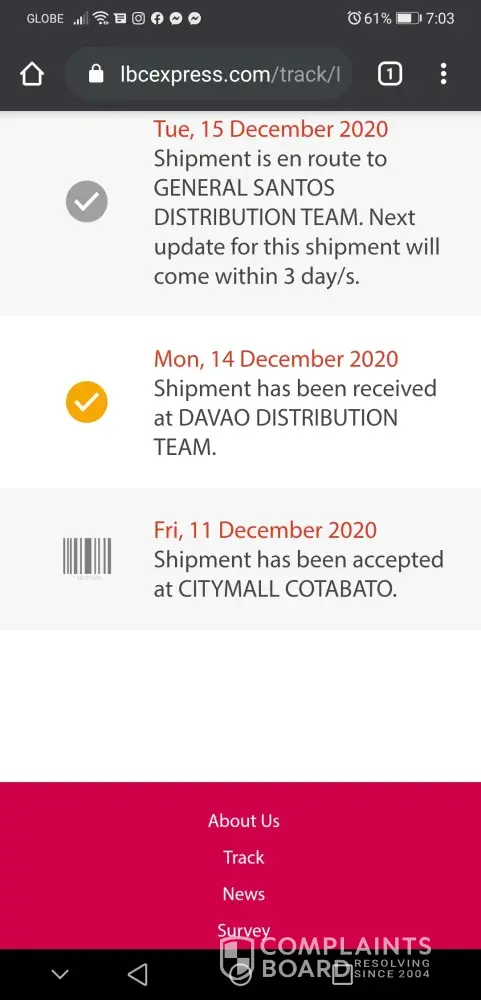 I just want to complain about my undelivered parcel. Dec. 18 I brought it personally to the Greenbelt Makati Lbc branch. The next day when I track it on their tracking website it says that it has been forwarded to the Upper Laguna delivery team so I assume the next day they would deliver it to the receivers address as soon as possible, but to my disappointment they didn't, so I waited for another 3 days until now for an update but there's none it's been 6 days I tried calling their customer care service but I can't contact them. So disappointing 😔