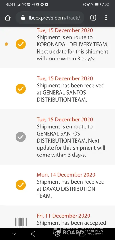 The item was sent to to the lbc last December 11, 2020 but until now my item is still not received. In their list of delivery which stated that the number of days from luzon to mindanao is 7 to 9 days due pandemic situation, now its already 13days and the item is still not here. Did they quarantine the item for 14days? I dont know what happened to LBC express.. Thank you