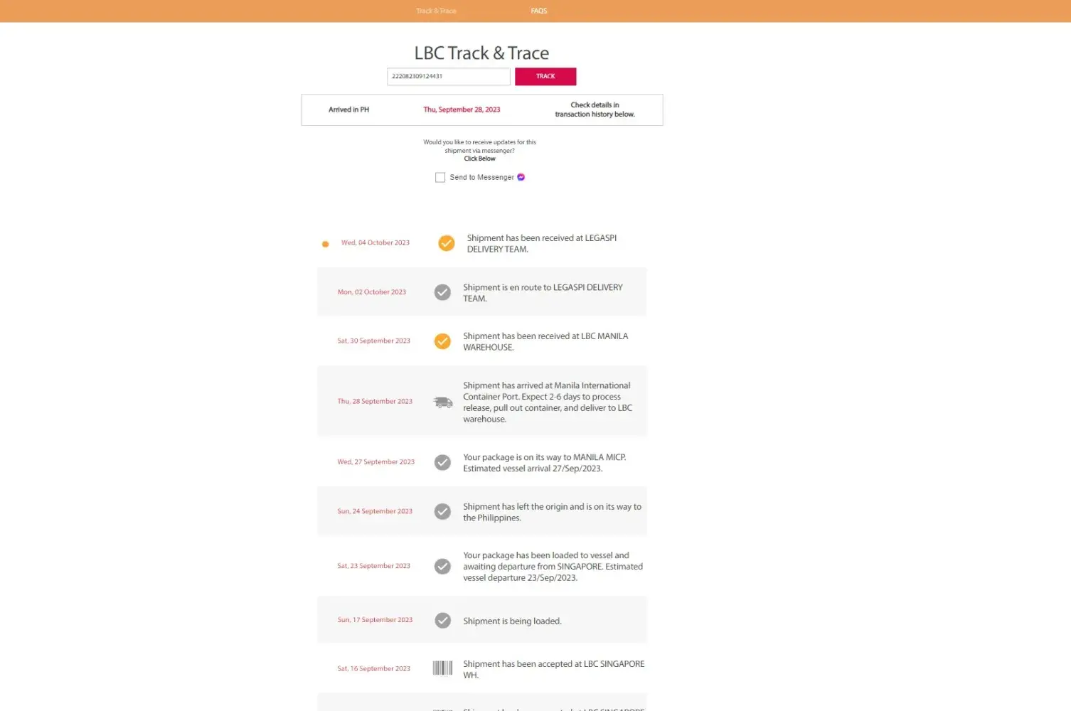There has been no progress in the shipment since it reached the Legazpi delivery team on October 4, 2023.