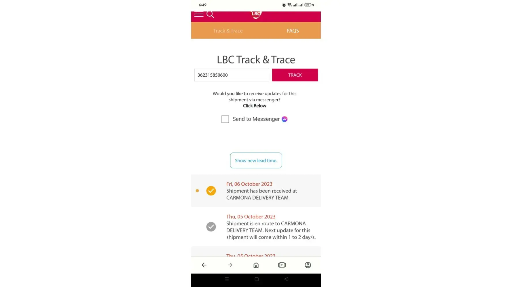 My receipt indicated that expected delivery date is October 6 to October 7, with tracking number 362315850600. I am trwcking my item thru their website and up to this date, it is still showing October 6, received wt Carmona Delivery team. I have file a complaint to their customer service numerous times and they would always tell me, check the status online and in the end, advised me to coordinate with the seller. This is the 2nd time that my item got missing and they are not holding themselves accountable with their poor customer service.