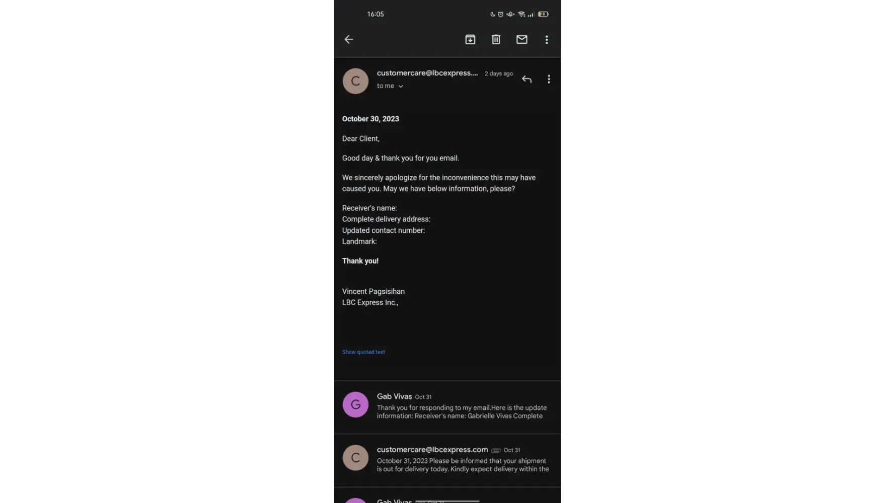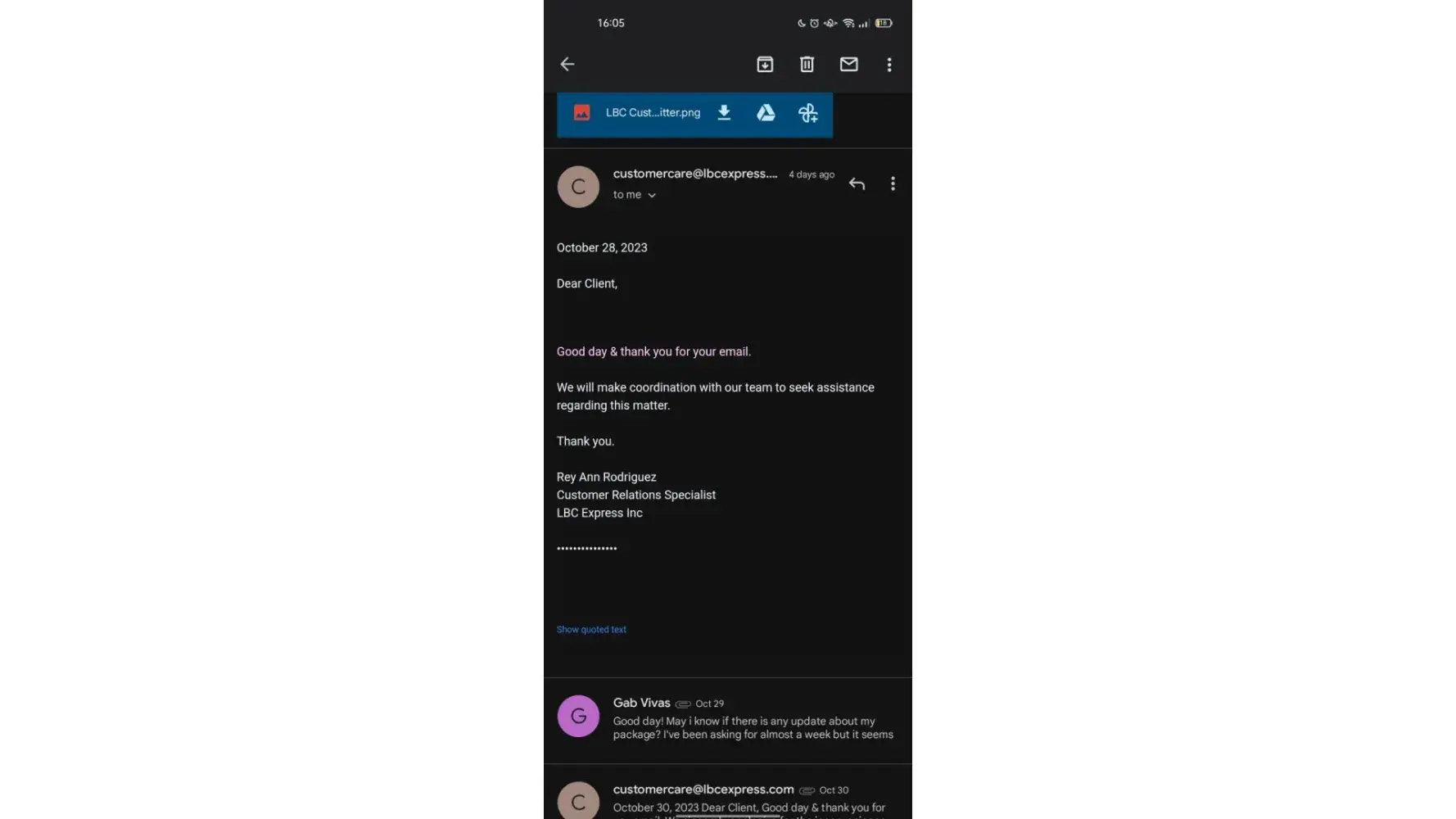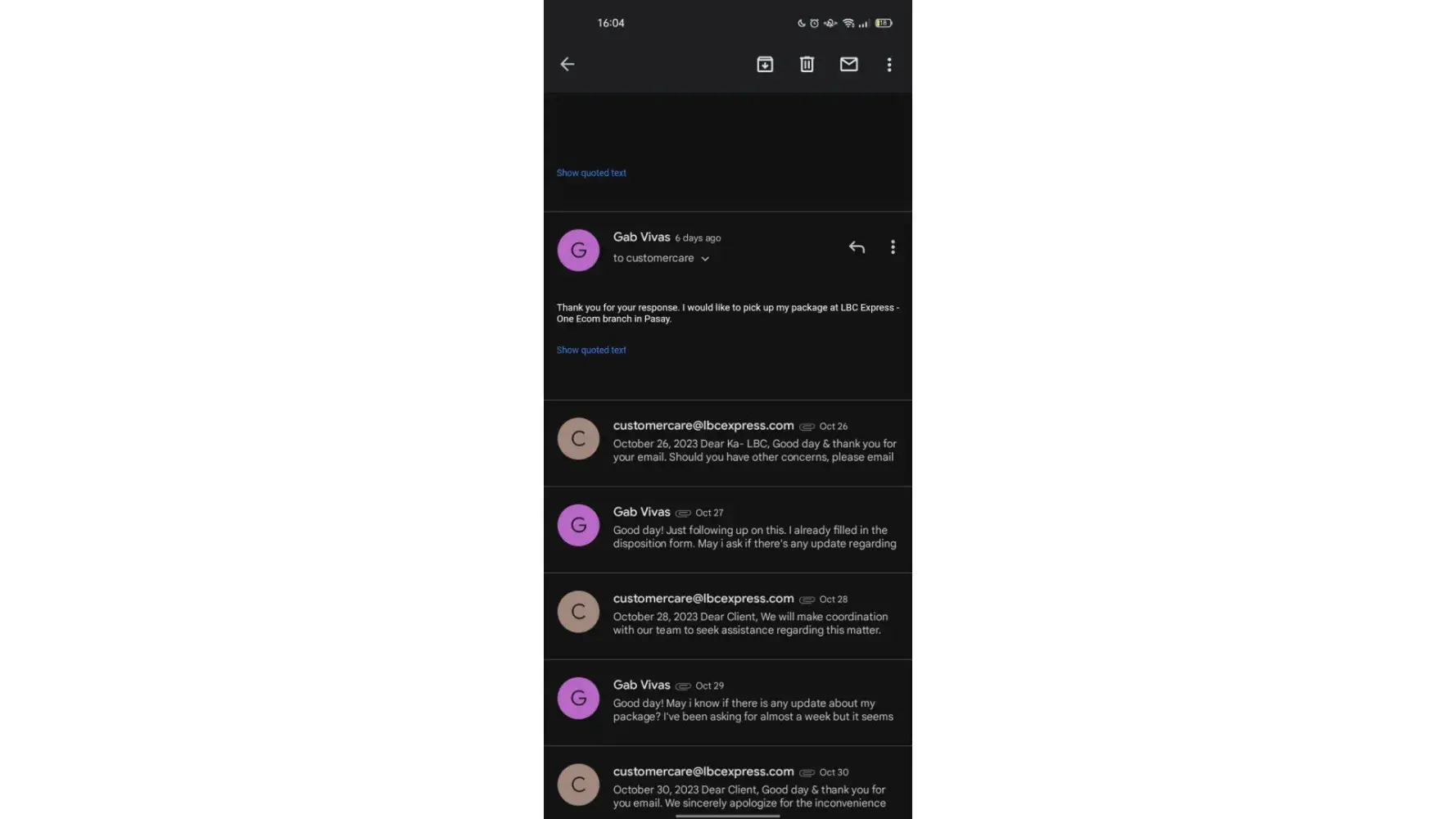 I sent a parcel from Mindanao to NCR last Dec 6, 2023. I was happy at first because upon checking at their online tracker after 3 days, my shipment is already out for delivery to my consignee. However, upon checking again on the 4th day, it says that my shipment is with a concern and that I should get in touch with their official customer channels. To make it short, my parcel is already overdue for its delivery and I have been keeping in touch with their customer service at least four times since Dec 10, 2023. As of this writing, my parcel that was sent last Dec 6, 2023 is not yet delivered to the consignee and already very long overdue in contrast to their promised 3 to 6 days delivery based on their website. And those are very important documents.